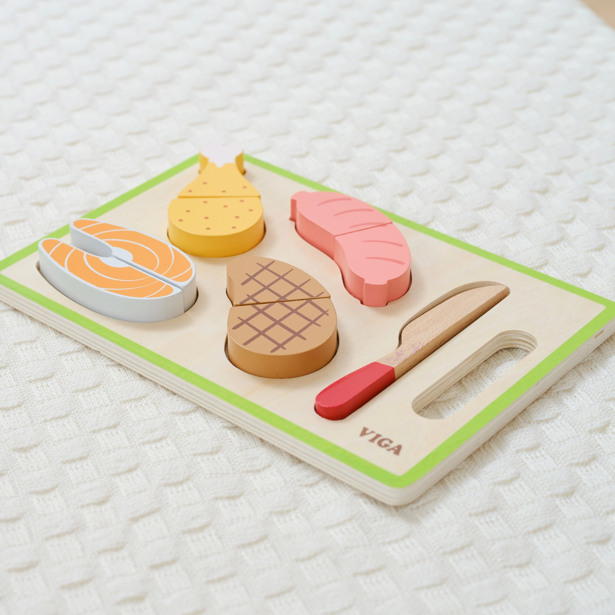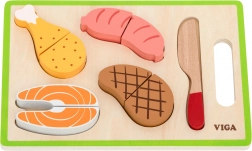 - Dřevěné prkénko s úchopem, dětský dřevěný nožík, dílky „masa“ k opakovanému krájení