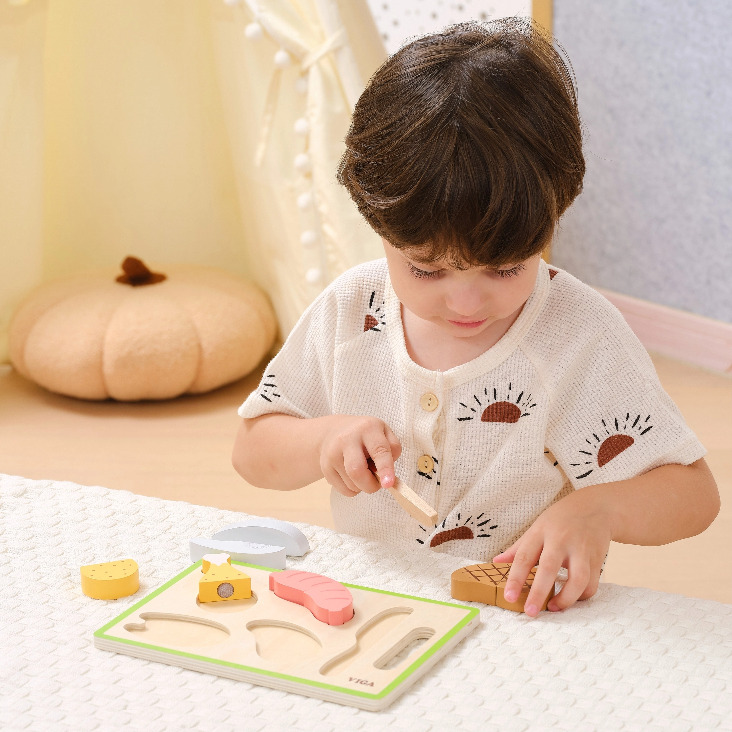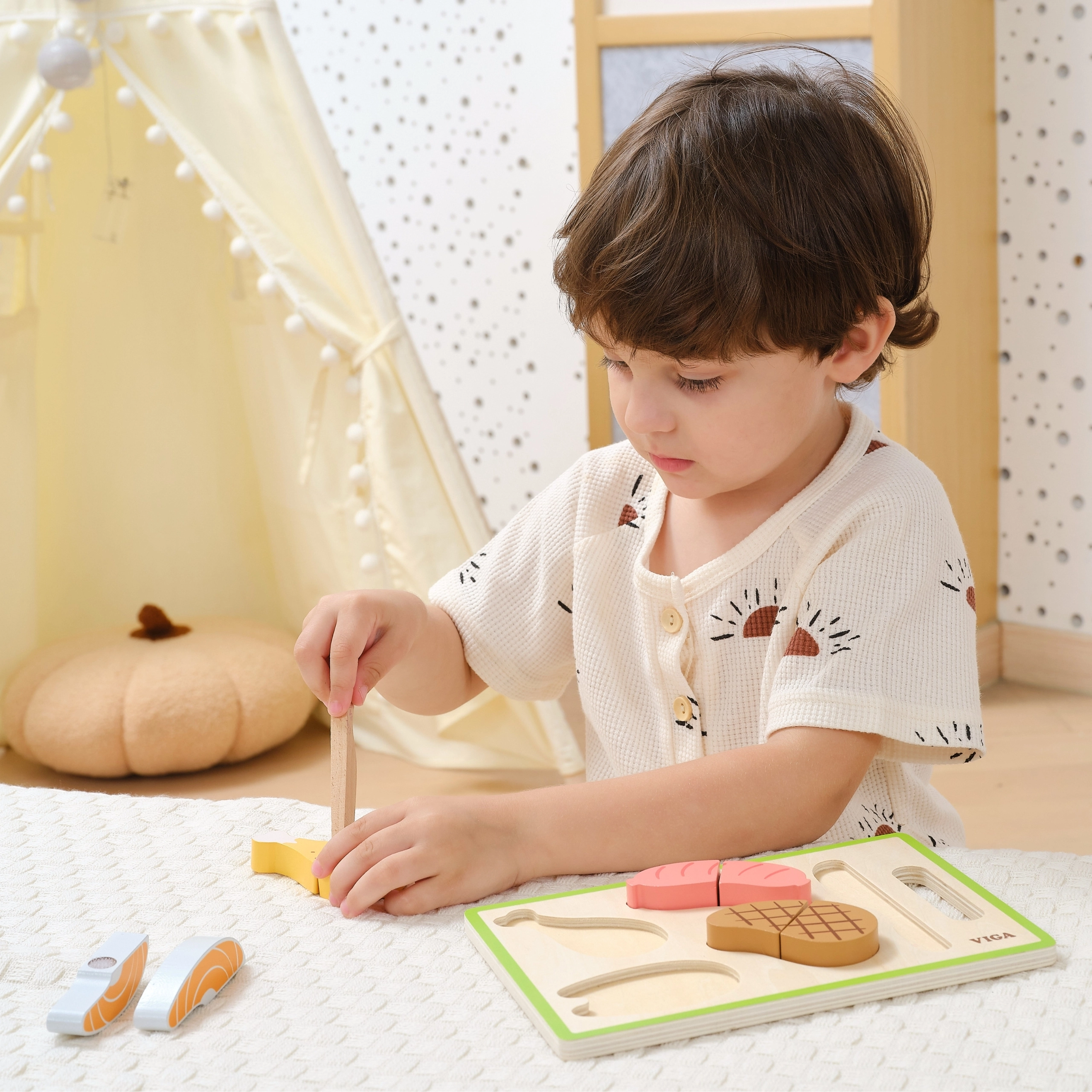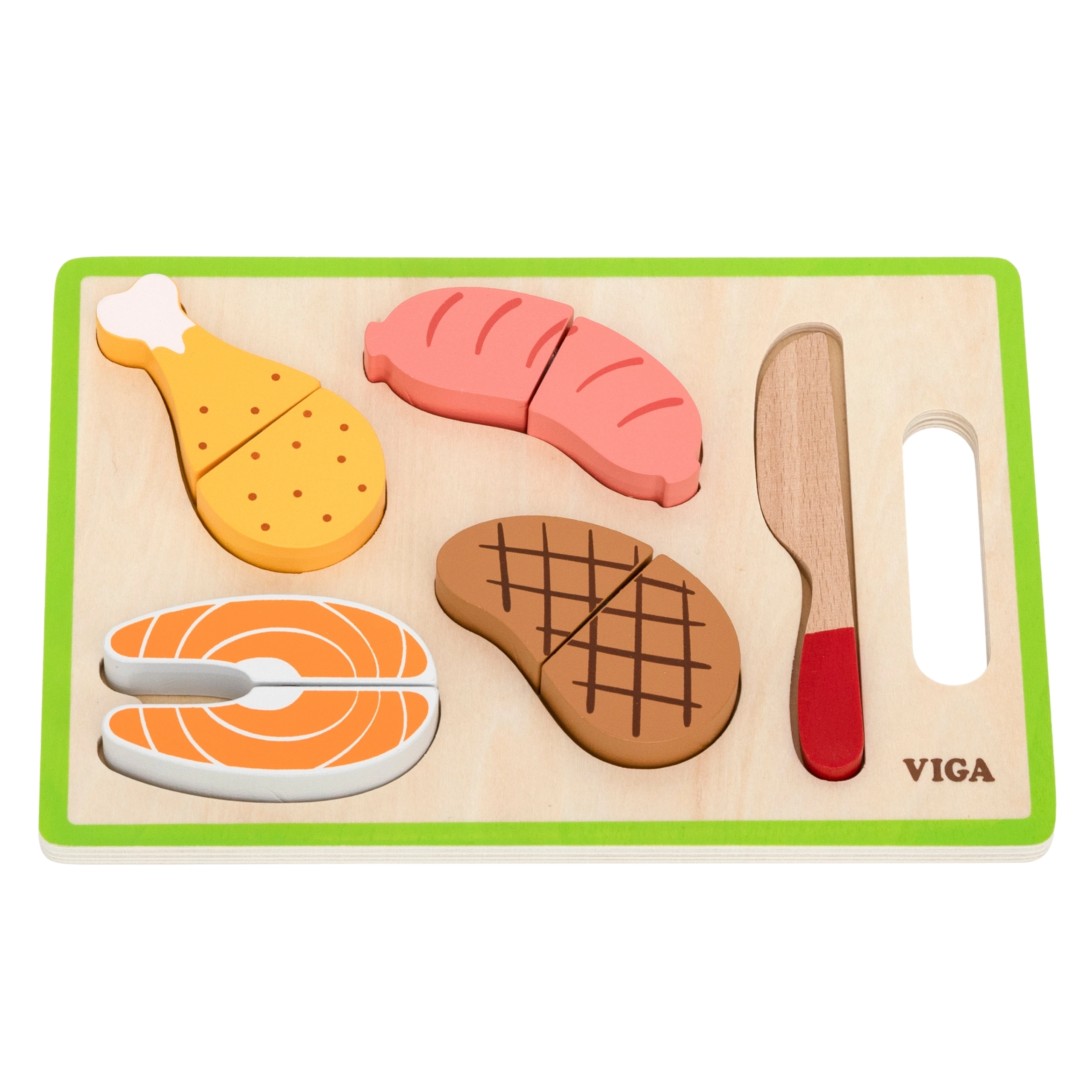 Objevte kreativní hru do dětské kuchyňky – dřevěná sada na krájení masa VIGA. Díky prvkům spojeným na suchý zip lze potraviny znovu a znovu „krájet“ a skládat, což podporuje jemnou motoriku, koordinaci oko–ruka i kreativní role-play. Sada je ideální doplněk k dětským kuchyňkám, má realistický vzhled a je vhodná již od 18 měsíců.