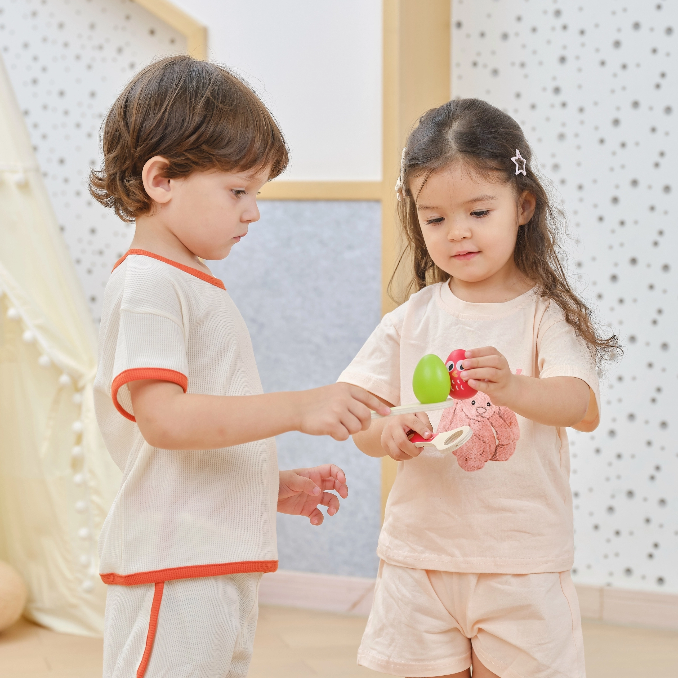Hladké dřevo s barevnými akcenty a pohodlnou rukojetí usnadňuje držení a pomáhá dětem soustředit se na rovnováhu vajíčka.
