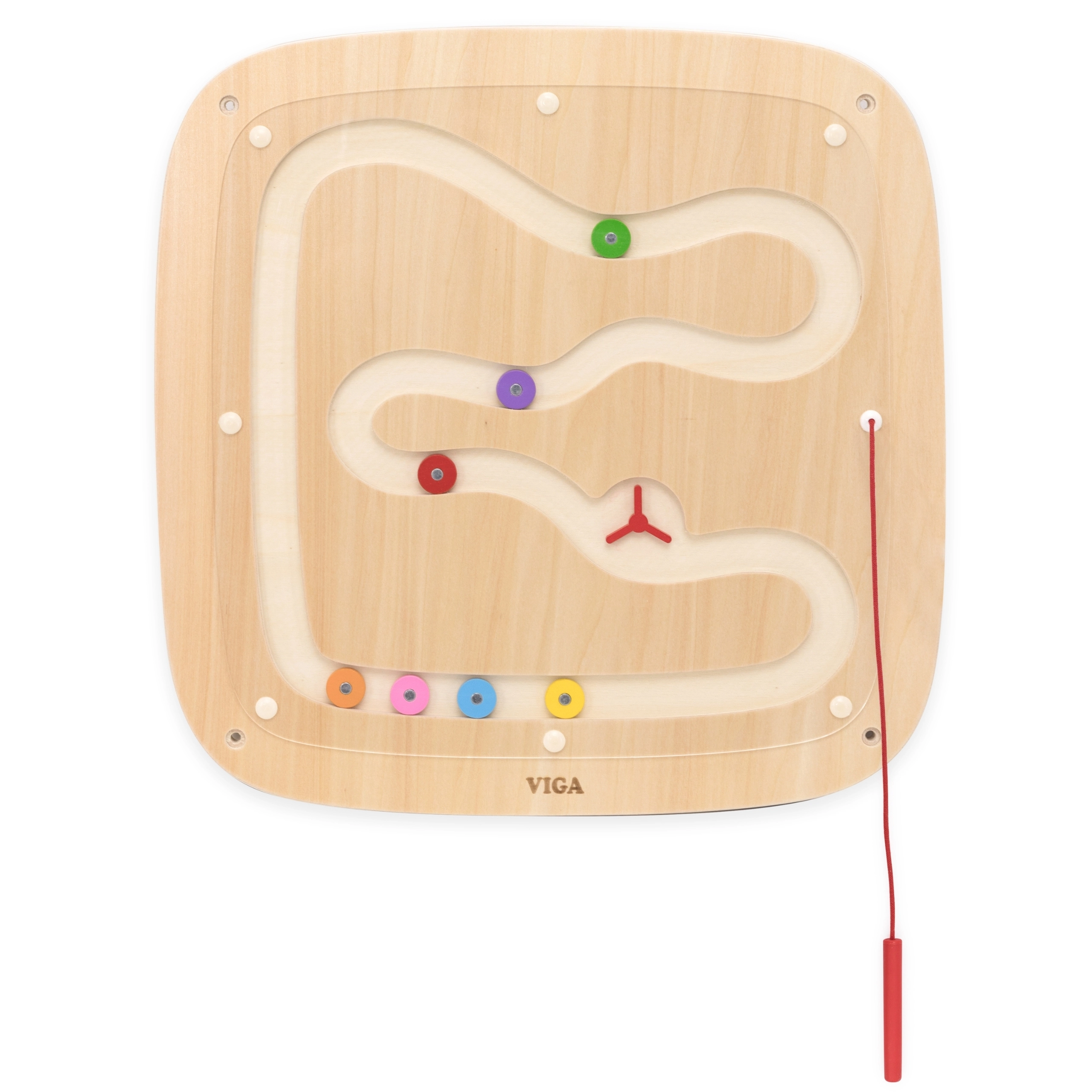 Tato nástěnná magnetická tabule VIGA je ideální pro dětské pokoje, školky i herny. Dvě různé trasy – jedna přímá a druhá zakřivená – dětem názorně ukazují, jak gravitace ovlivňuje rychlost a trajektorii pohybu. Přiložené magnetické pero na šňůrce bezpečně vede barevné kotoučky pod průhledným krytem.