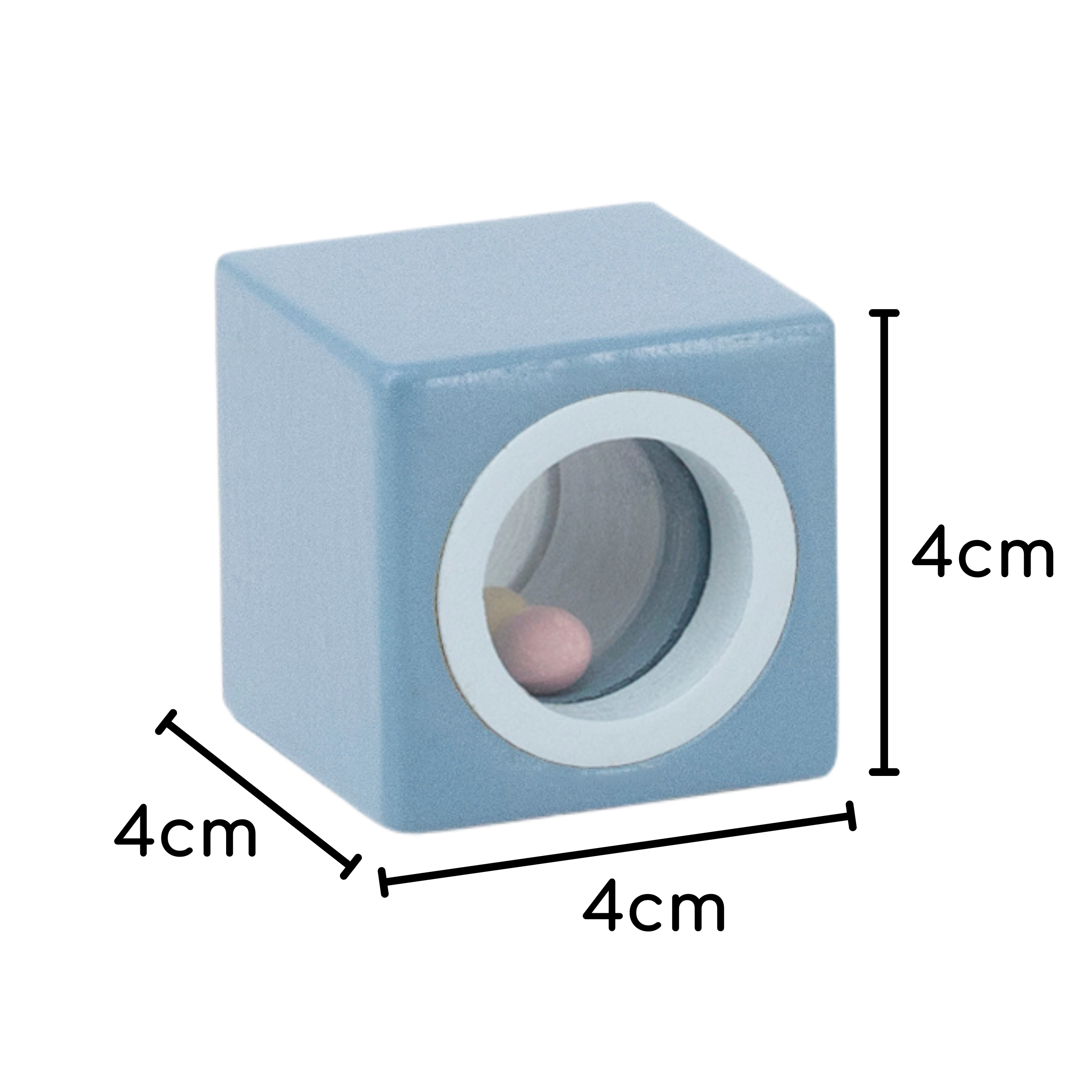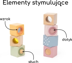 Každá kostka má jedinečný prvek pro multisenzorickou stimulaci – od zrcátka přes chrastítko až po hmatové struktury. Díky přívětivým rozměrům se snadno uchopují, rozvíjejí koordinaci oko–ruka, jemnou motoriku a podporují kreativní volnou hru.