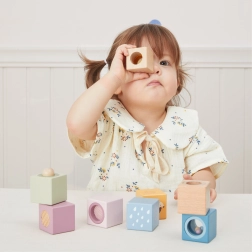 Kostky s vložkami jako zrcátko, čočky, chrastítko či zvonek podněcují hmat, zrak i sluch a motivují děti k objevování.