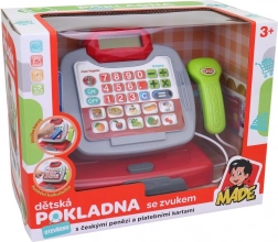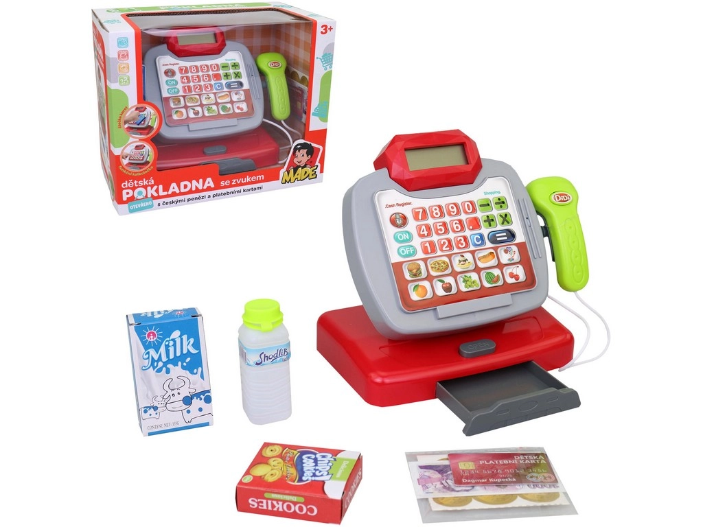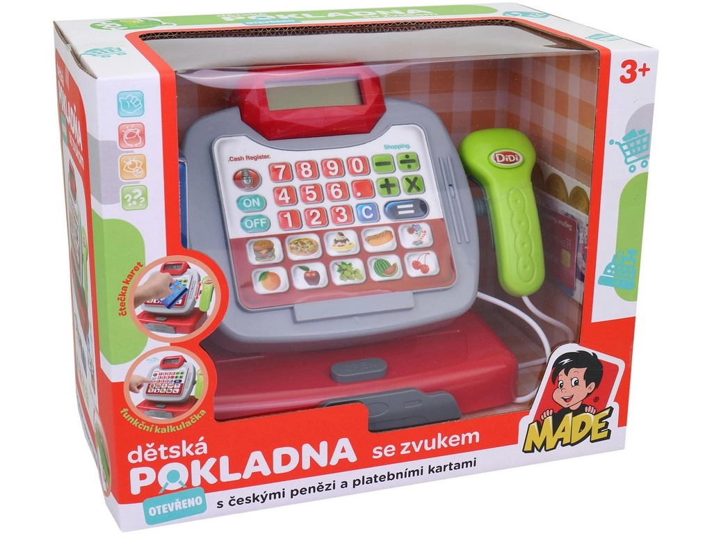 Dětská pokladna s českým designem potěší všechny malé prodavače. Nabízí světelné a zvukové efekty, funkční scanner pro načítání cen, digitální kalkulačku a bohaté příslušenství včetně českých papírových peněz, platebních karet a plastových mincí. Napájení zajišťují 2× AA baterie (součástí). Vhodné pro děti od 3 let.