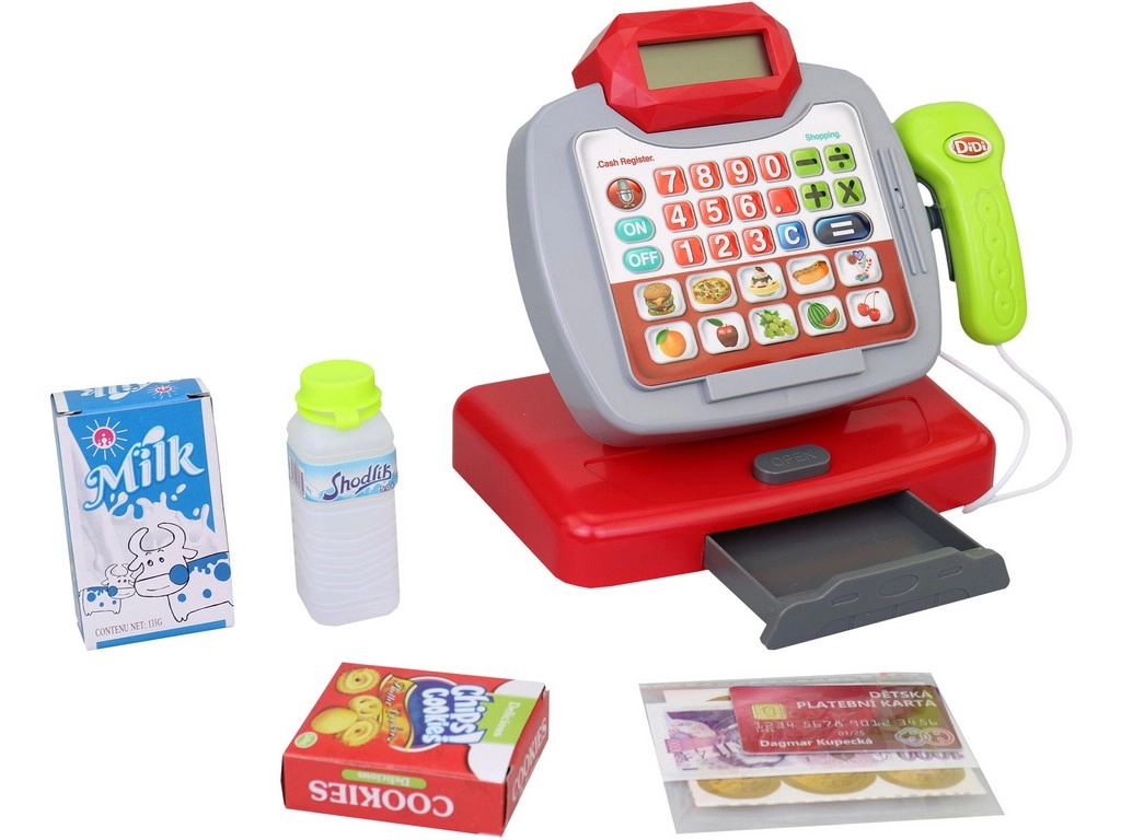 - Realistická hra na obchod – scanner s načítáním cen, zvuky a světla při platbě kartou.