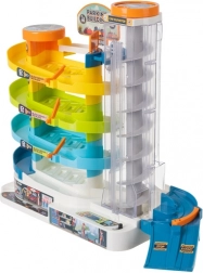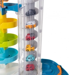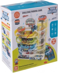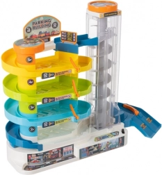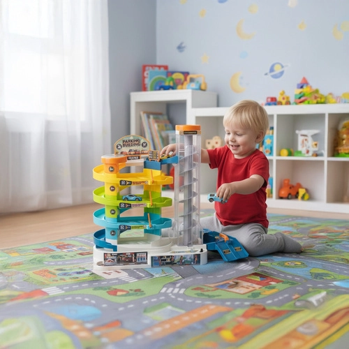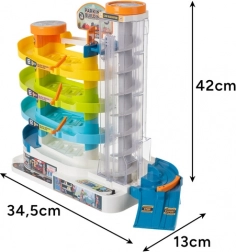 Tato barevná parkovací garáž přináší dětem dynamickou hru s autíčky – zvedněte je pomocí manuálního nebo elektrického výtahu do horních pater a sledujte, jak se po spirálových drahách svižně vracejí dolů. Díky pěti úrovním je zde spousta prostoru pro jízdu, parkování a vytváření vlastních dopravních situací.