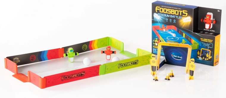 Zažijte rychlou a napínavou zábavu s setem robo fotbalu FOOSBOTS od Fat Brain. Kompaktní stolní stadion s mantinely, 2 robotickými hráči a míčem doplňuje tréninkový set s terčem pro přesnou střelbu. Ideální pro hlavové souboje, rychlé reflexy a rodinné turnaje kdekoliv na stole.