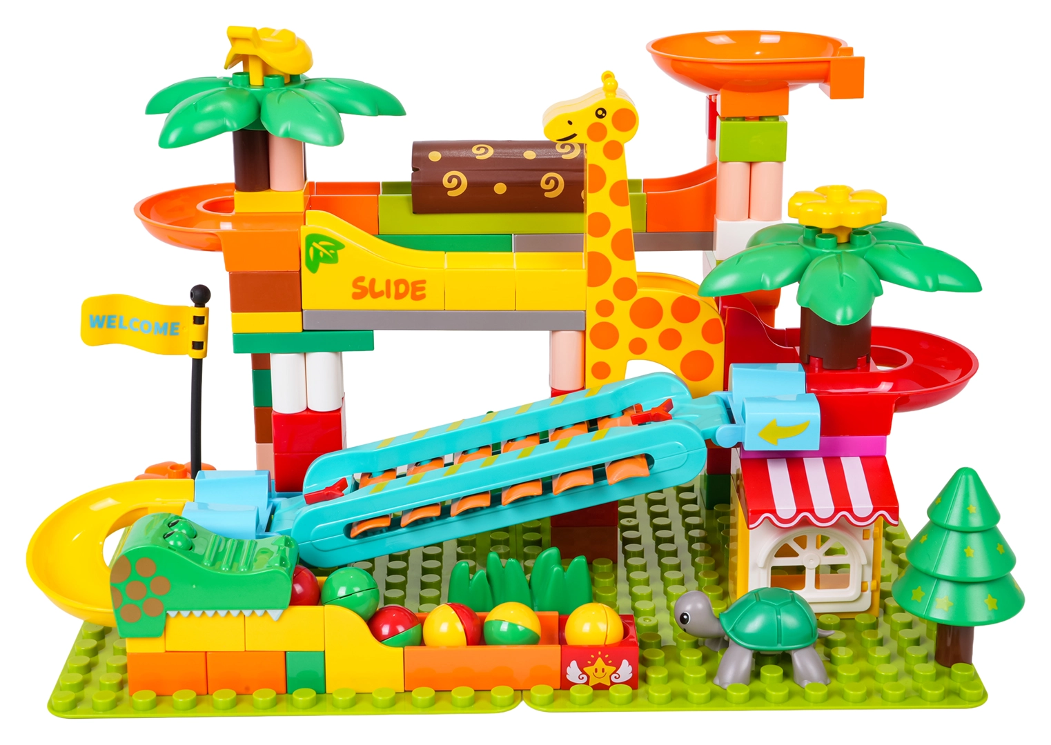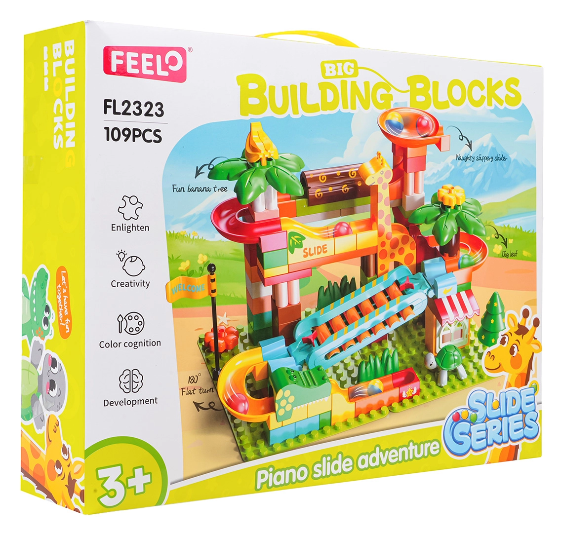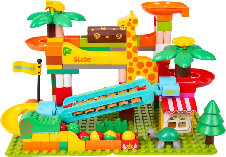 Tato kreativní stavebnice přináší do dětského pokoje atmosféru safari: palmy, zvířátka a domeček doplňuje promyšlená kuličková dráha se skluzavkami, trychtýři a piano prvkem – když kuličky projíždějí přes cymbálky, vytvářejí veselé melodie. Stabilní základna a snadné zacvaknutí dílků zaručí pohodové stavění i hraní.