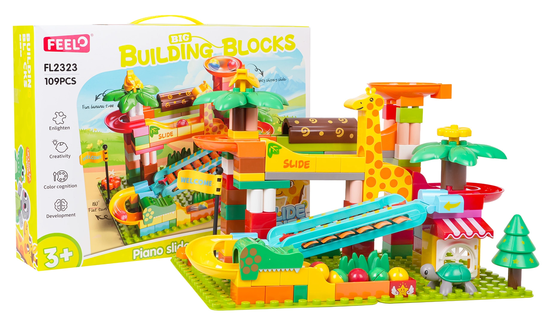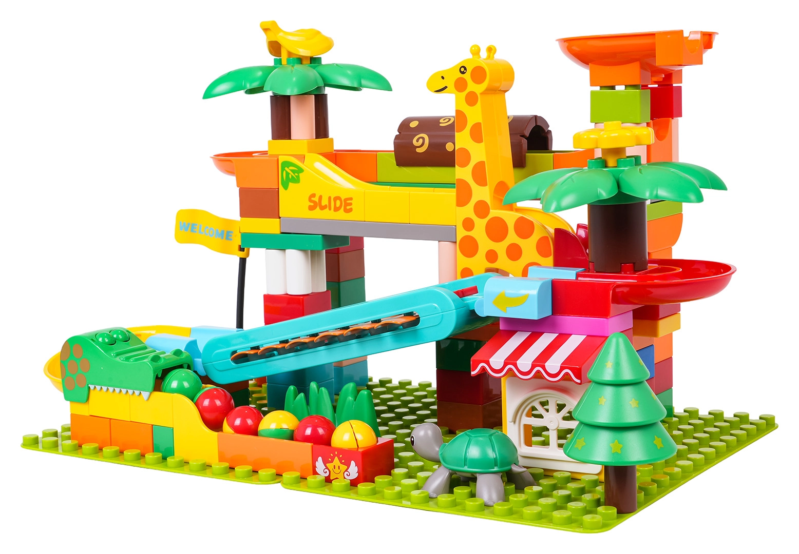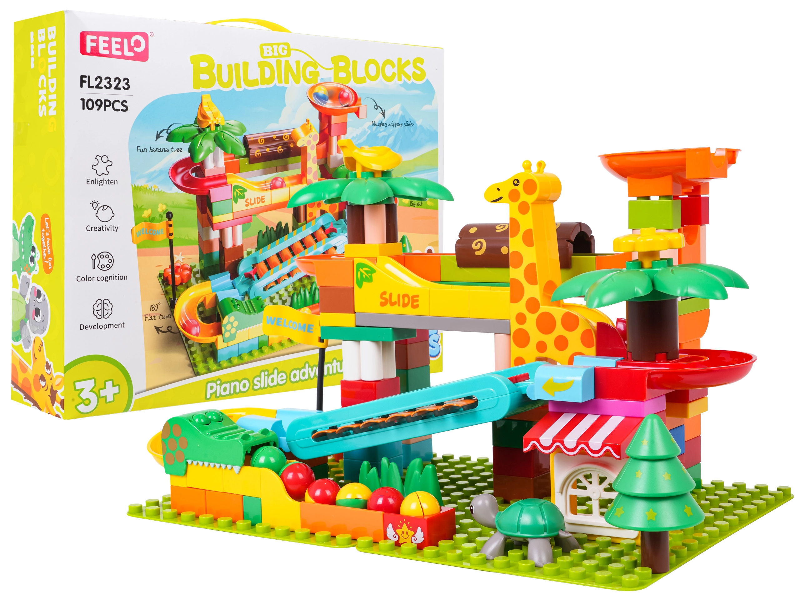 Tato kreativní stavebnice přináší do dětského pokoje atmosféru safari: palmy, zvířátka a domeček doplňuje promyšlená kuličková dráha se skluzavkami, trychtýři a piano prvkem – když kuličky projíždějí přes cymbálky, vytvářejí veselé melodie. Stabilní základna a snadné zacvaknutí dílků zaručí pohodové stavění i hraní.