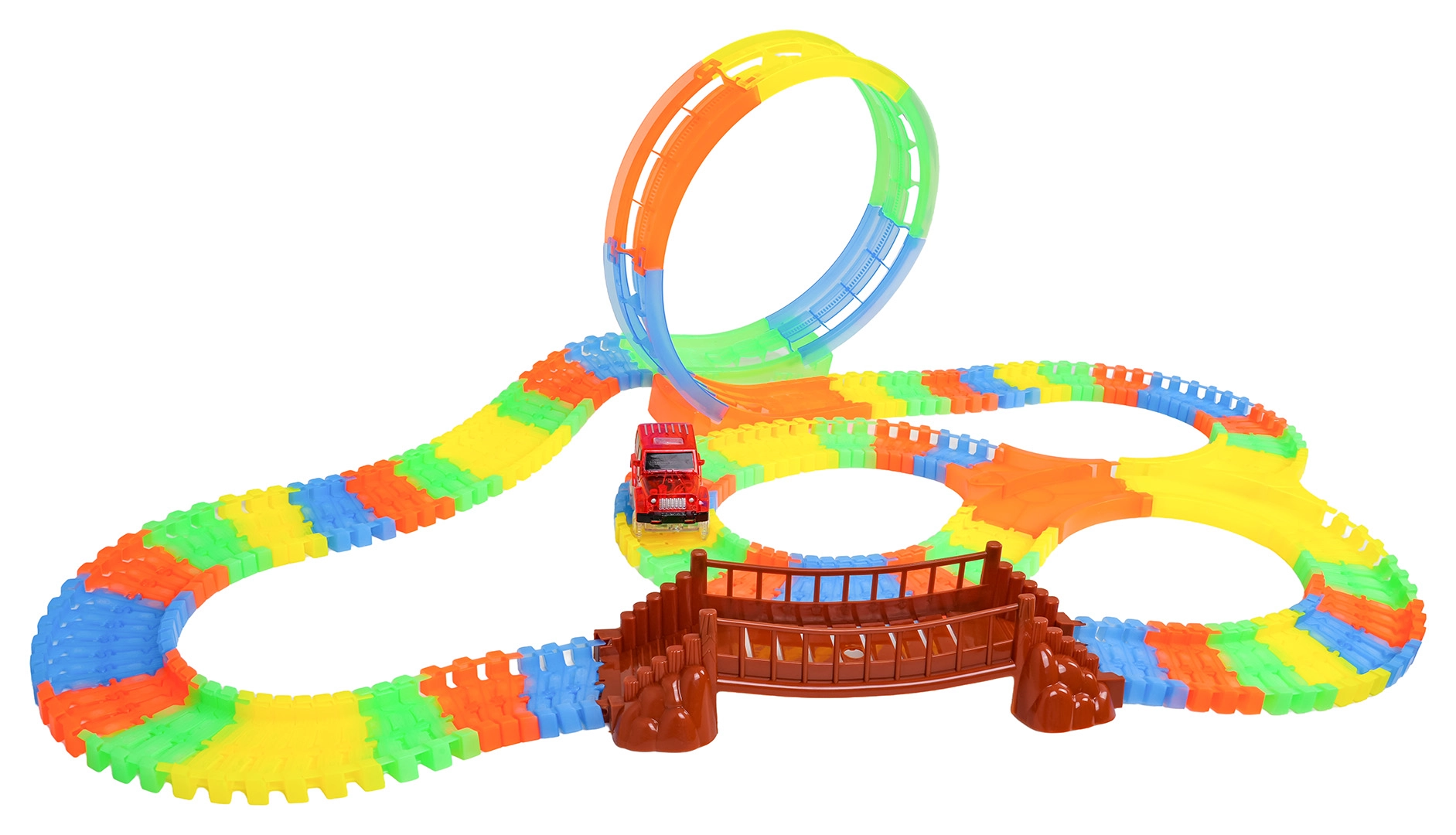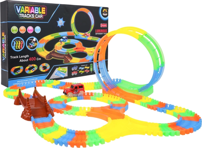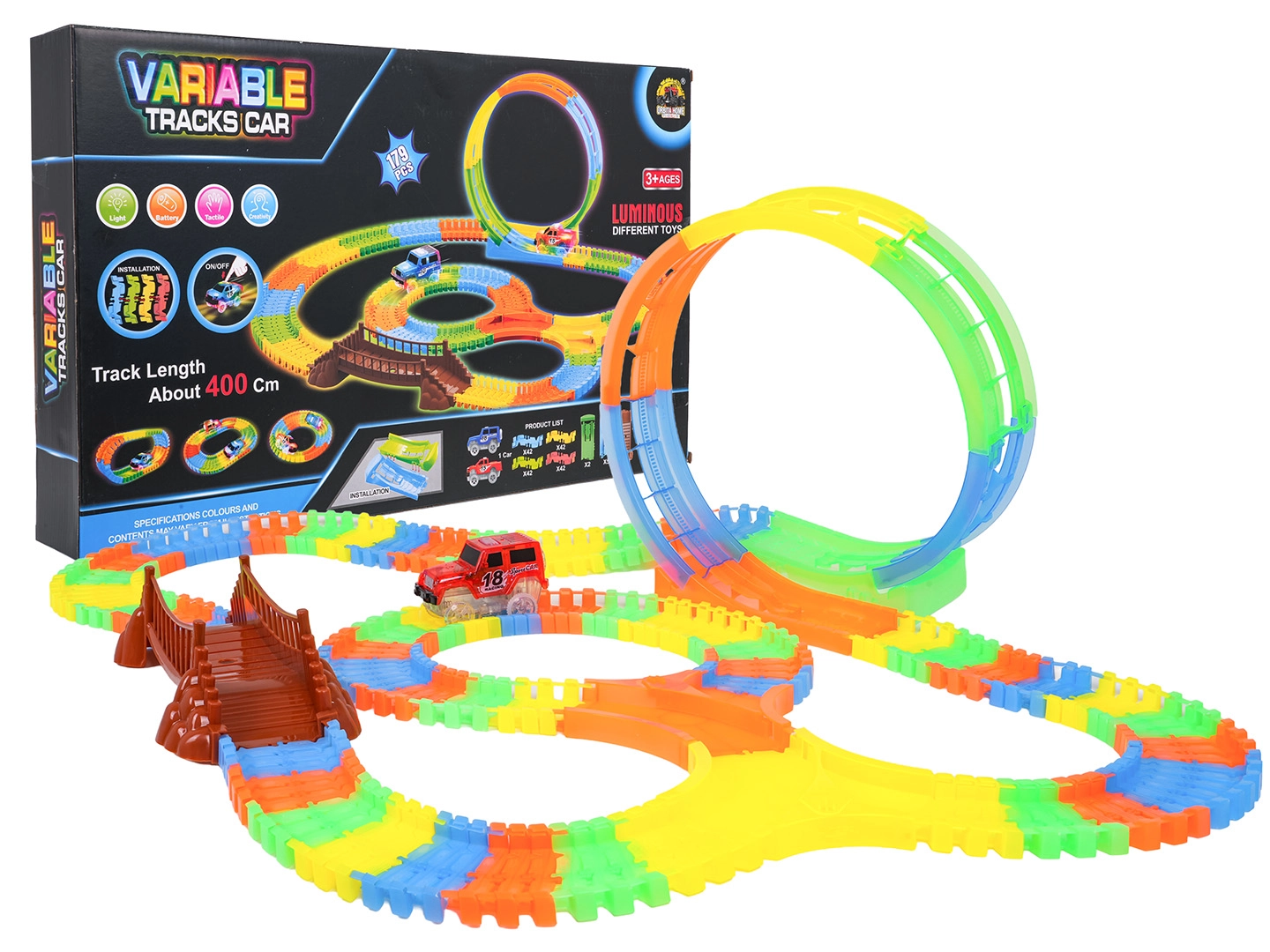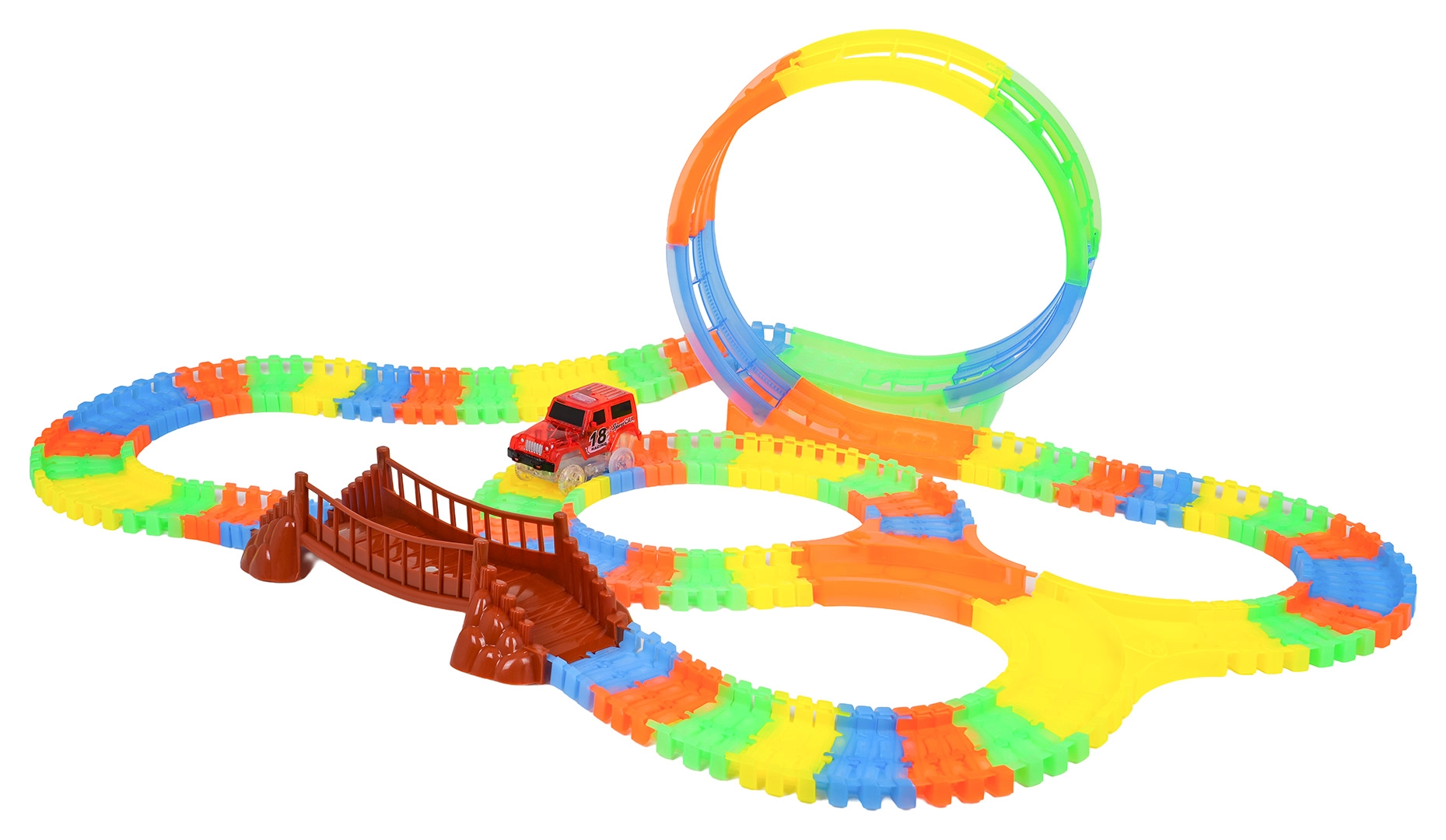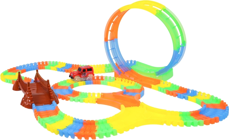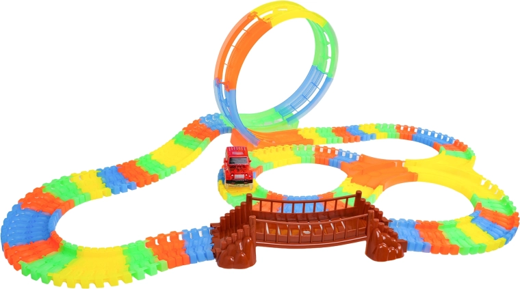 Tato barevná autodráha potěší děti už od 3 let. Díky flexibilním segmentům si postavíte rovinky, zatáčky, most i velkou svislou smyčku – a to během chvilky. Fluorescenční provedení zajistí efekt záře ve tmě, zatímco LED autíčko projíždí tratí a zanechává světelnou stopu.