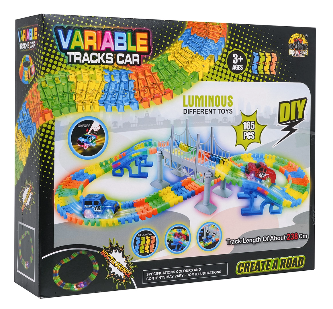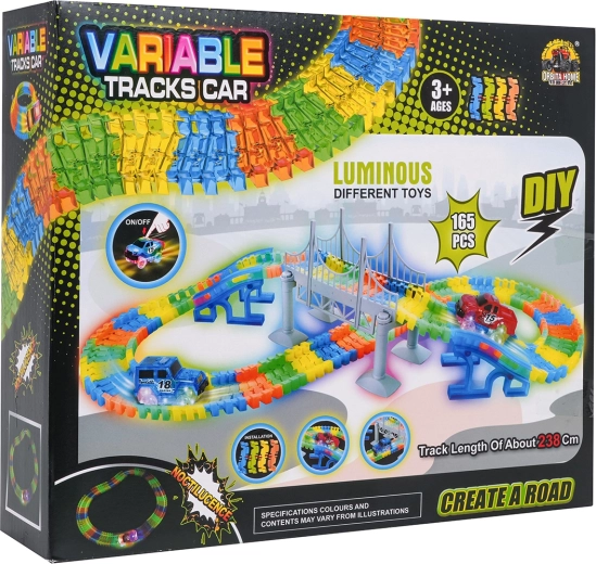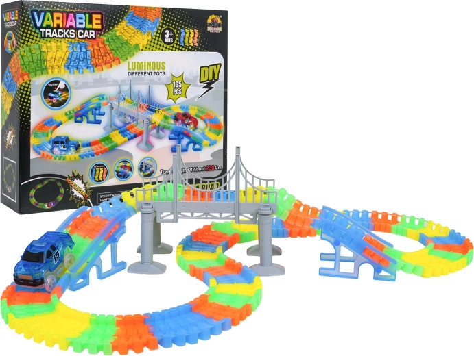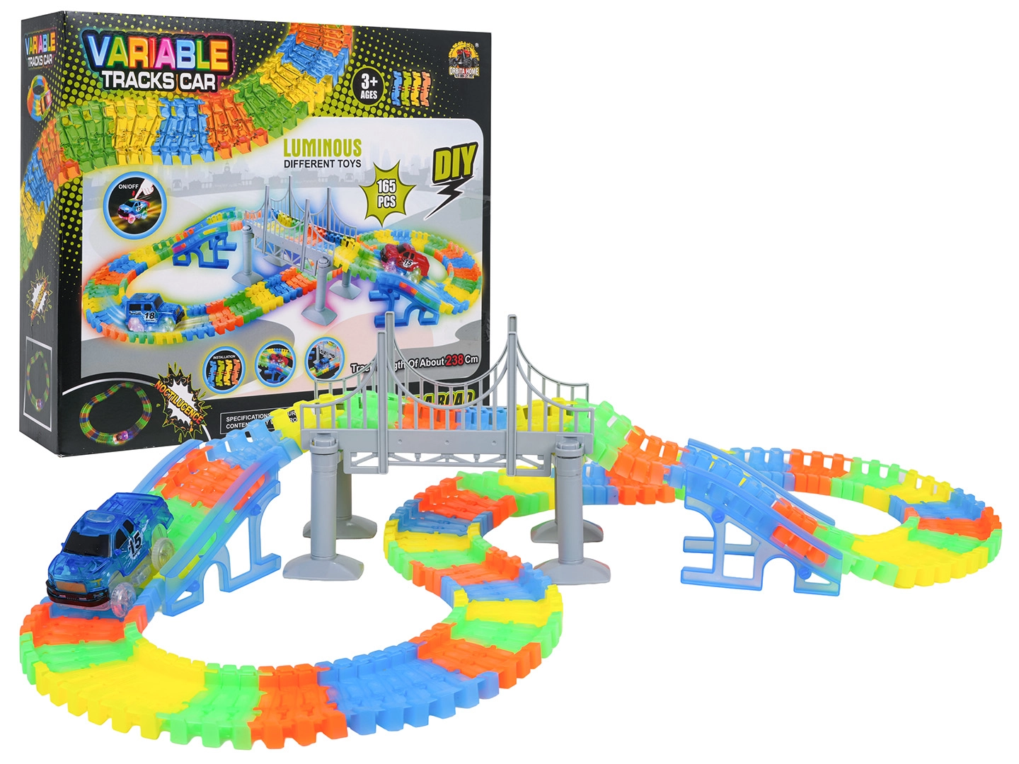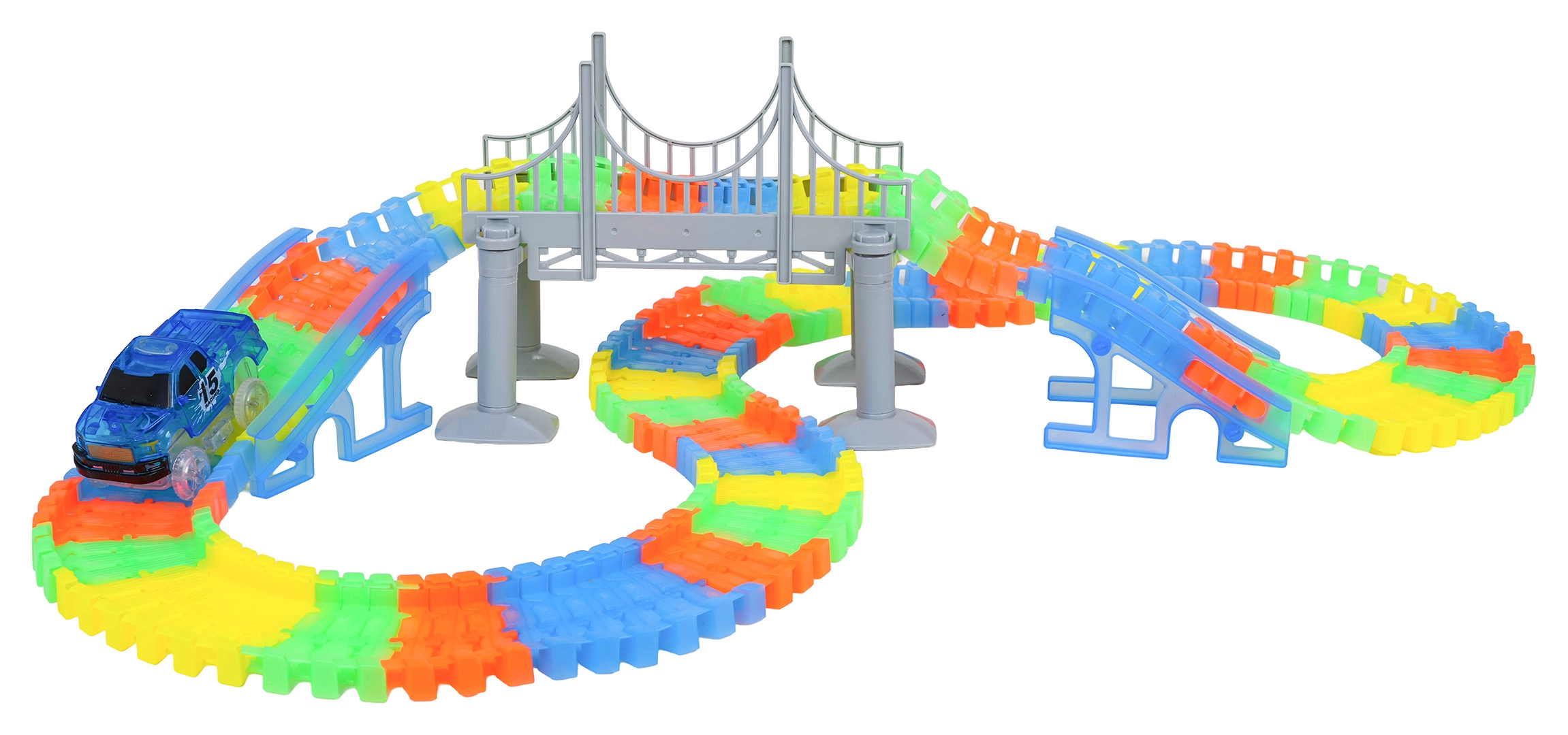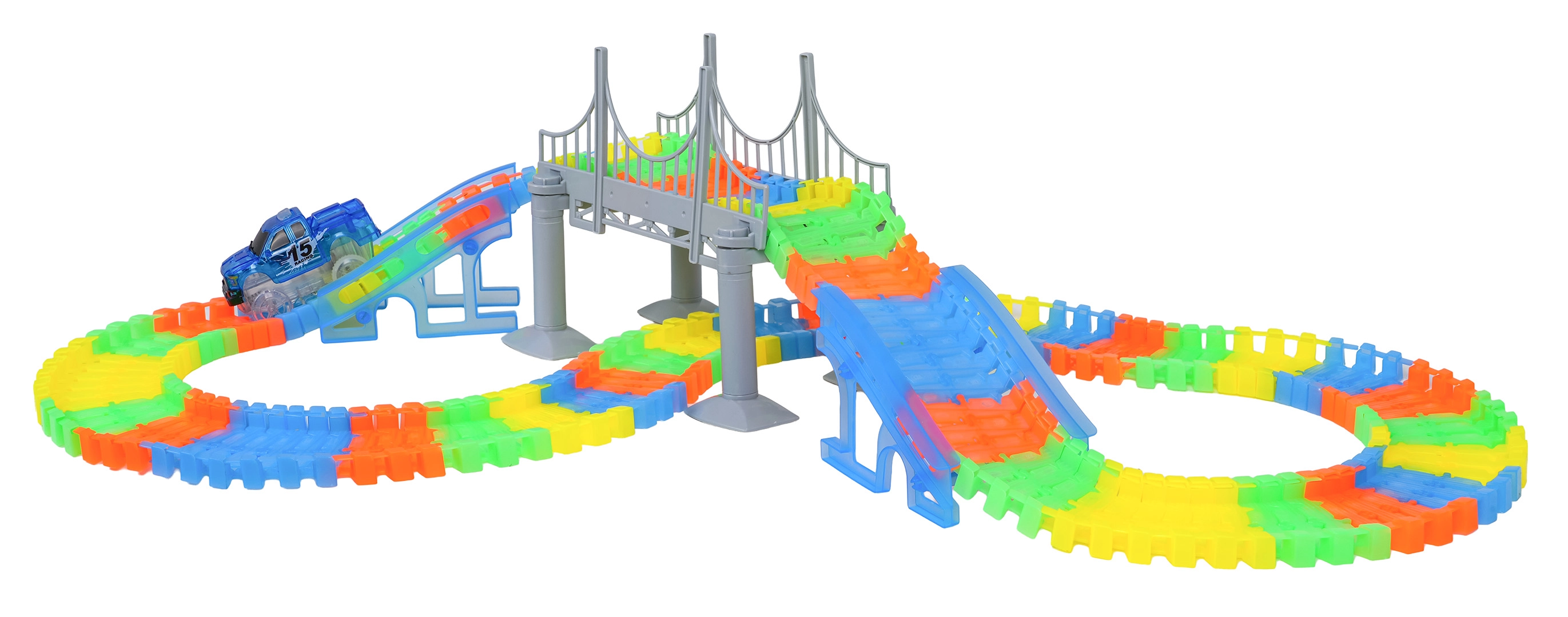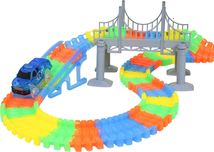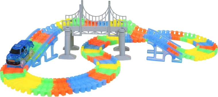 Tato kreativní závodní dráha nabízí dětem od 3 let hodiny nápadité hry. Díly se do sebe snadno zacvakávají, trať je ohýbatelná a otočná, takže si můžete vytvářet mosty, rampy i odvážné zatáčky. Fluorescenční provedení kolejí rozzáří pokoj po zhasnutí světel.