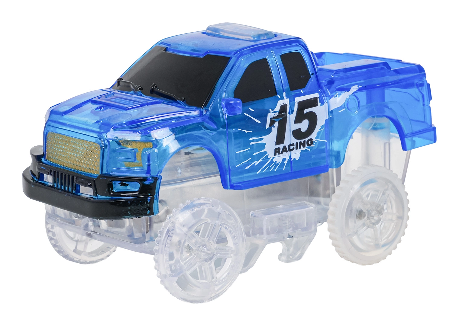 Průhledné závodní autíčko s LED diodami oživí trať. Stačí stisknout tlačítko na střeše. Napájení 2× AA (nejsou součástí).