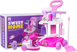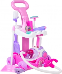 Set nabízí komplexní výbavu: dlouhý kartáč, lopatku, smetáček, mycí stěrku na okna, houbičku, atrapy čisticích prostředků a polystyrenové kuličky pro vysavač. Díky chytrému uspořádání na dvou policích je vše přehledně uloženo a snadno přenosné.