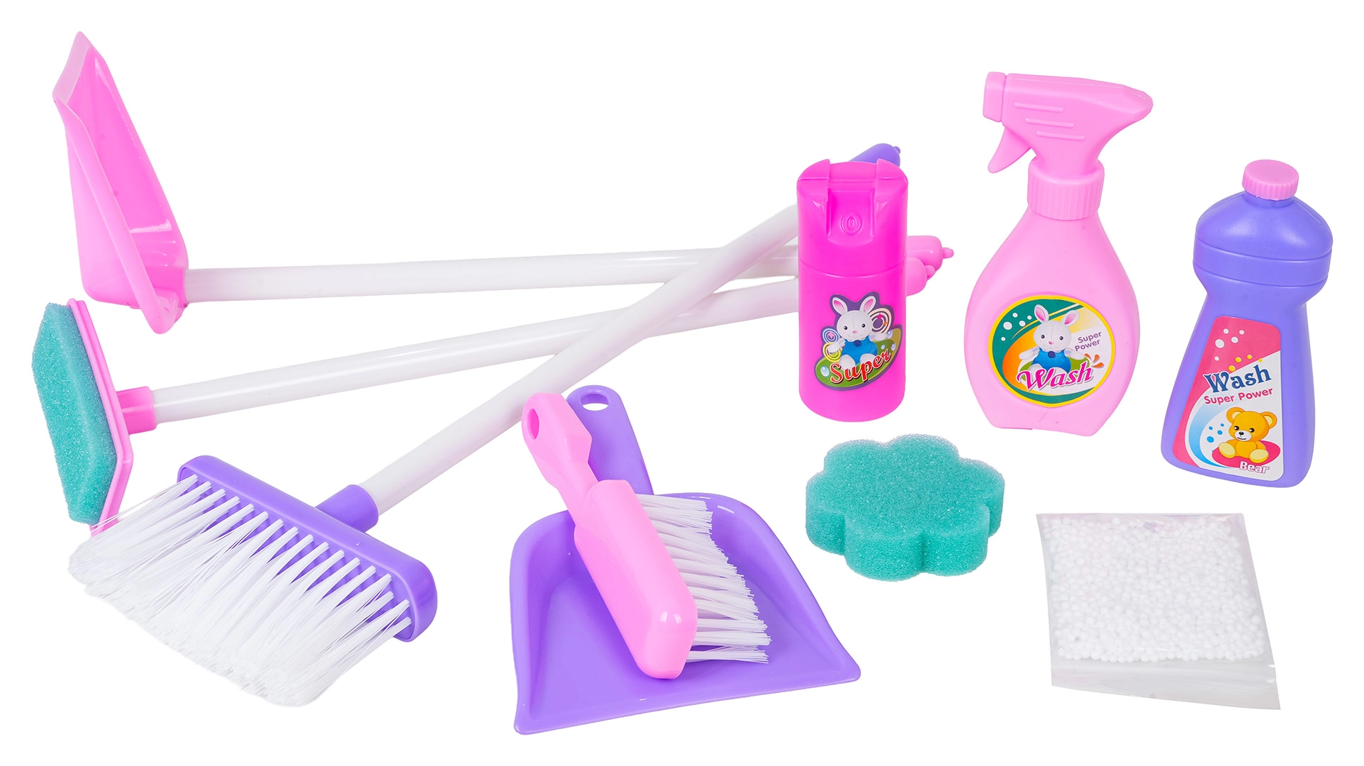 Koště, lopatky, smetáček, mycí stěrka, houbička a atrapy čisticích prostředků. Nechybí ani polystyrenové kuličky určené do vysavače.