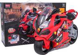 Motocykl, 3× klíč, šroubky, dekorativní nálepky, instrukce, pipeta na vodu
