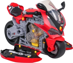 Tato chytře navržená hračka kombinuje motocykl pro imaginativní jízdu a mechanickou dílnu pro malé kutily. Po otevření bočních panelů se odhalí svítící písty motoru, které lze vyjmout a zkoumat. Děti se naučí základním principům fungování stroje hravou formou a zároveň rozvíjejí jemnou motoriku i zručnost.