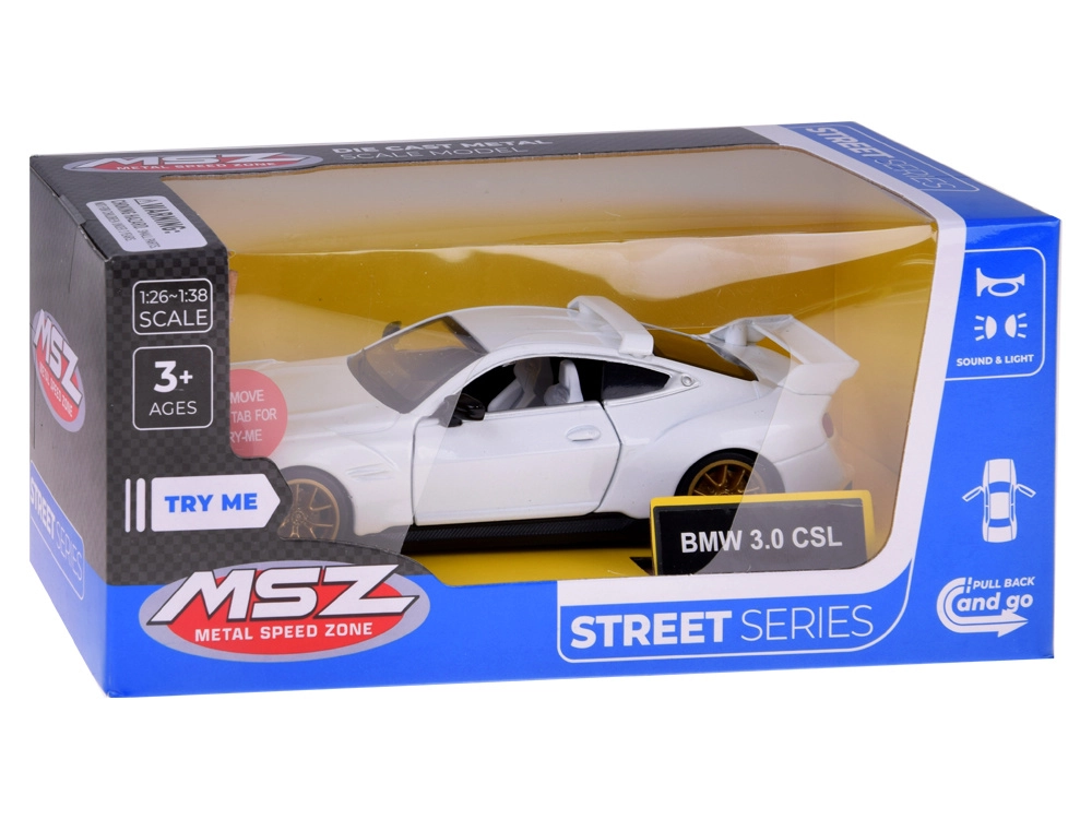 Objevte ikonický sportovní vůz BMW 3.0 CSL v měřítku 1:34 jako kvalitní kovový model s otevíracími dveřmi, světelnými a zvukovými efekty a zpětným natahováním (pull-back). Realistické detaily karoserie a interiéru, gumová kola pro plynulou jízdu a atraktivní design z něj dělají skvělou hračku i sběratelský kousek.