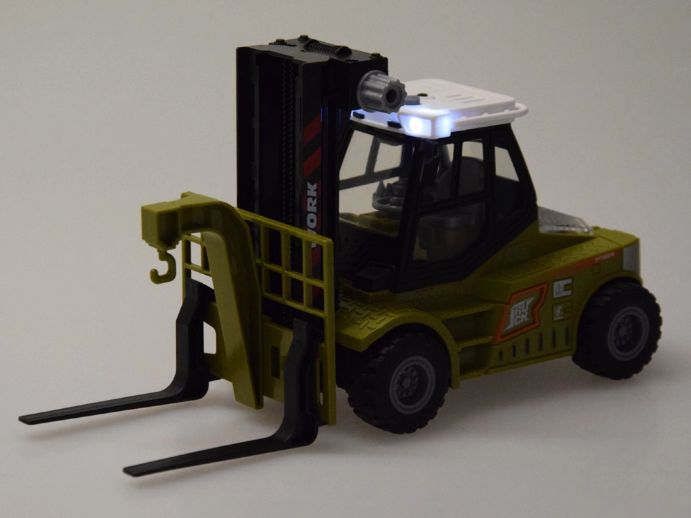 Dvě tlačítka ovládají 4 různé zvuky (start, couvání, zdvih, klakson) doplněné blikajícím bílým světlem pro maximální zážitek z hry.