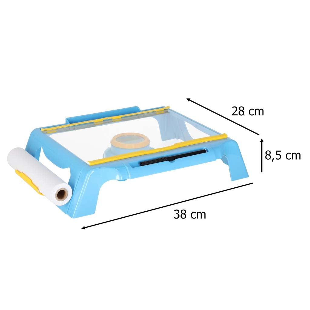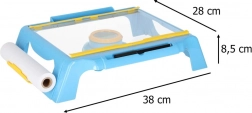Stabilní plastová základna se šikmou pracovní plochou a držákem papírové role zajistí dětem komfortní podmínky pro kreslení doma i na cestách.
