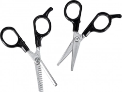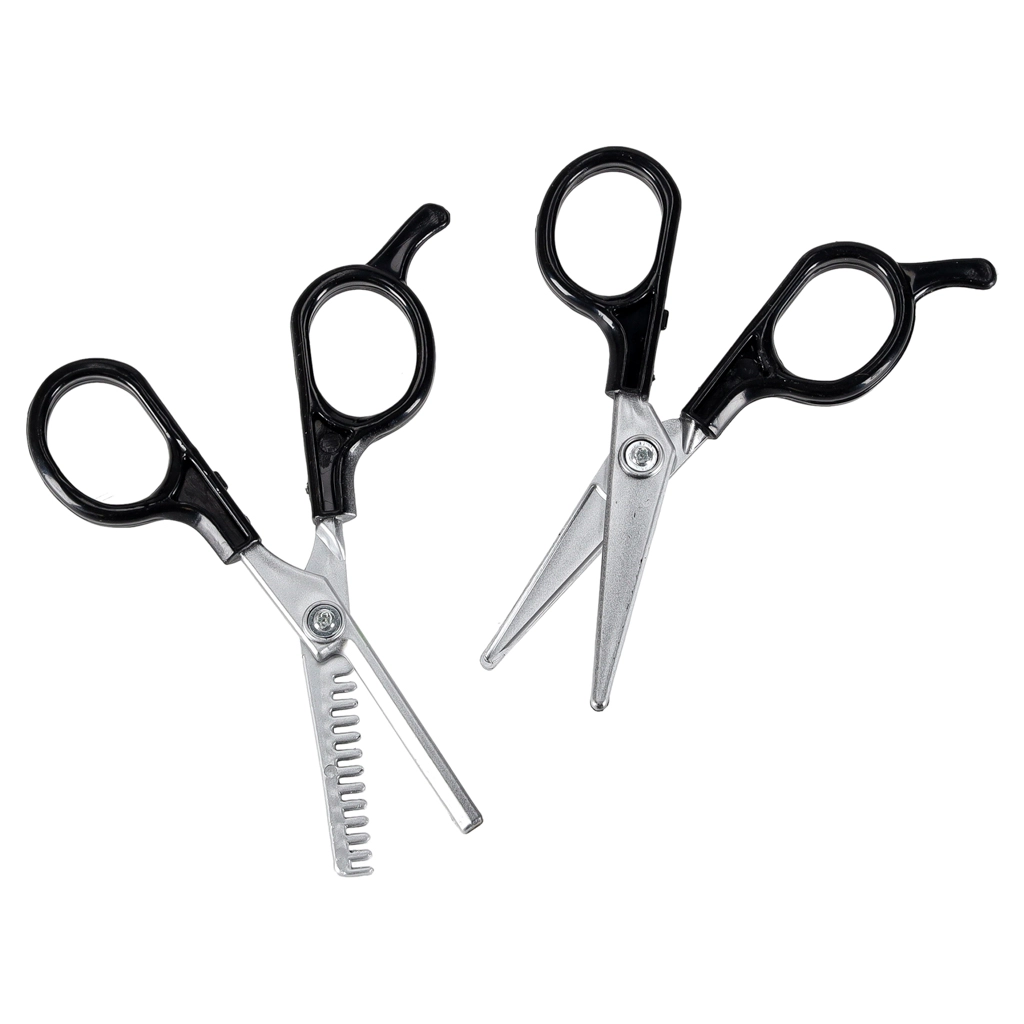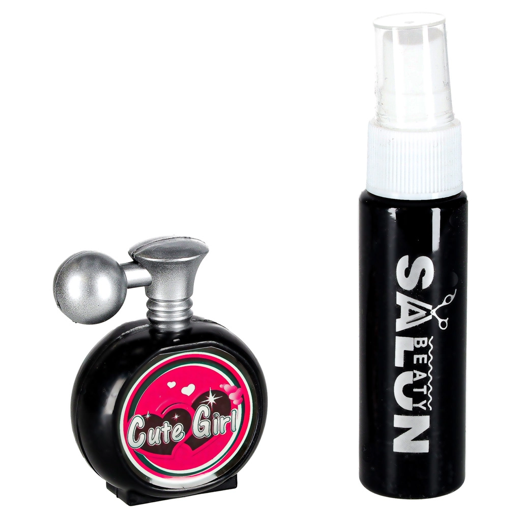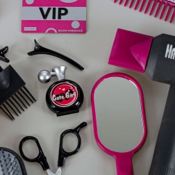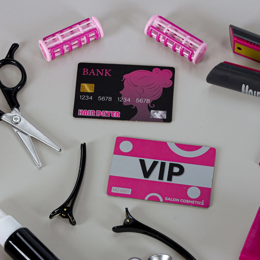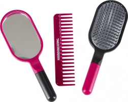 Zrcátko, kartáč, hřeben, bezpečnostní nůžky a efilační nůžky, natáčky s klipsy, lahvičky na „kosmetiku“ i platební kartičky pro hru na salon.