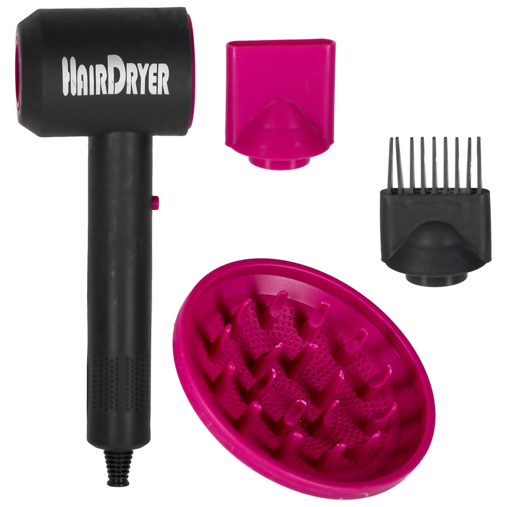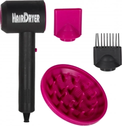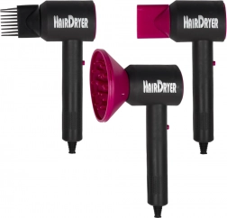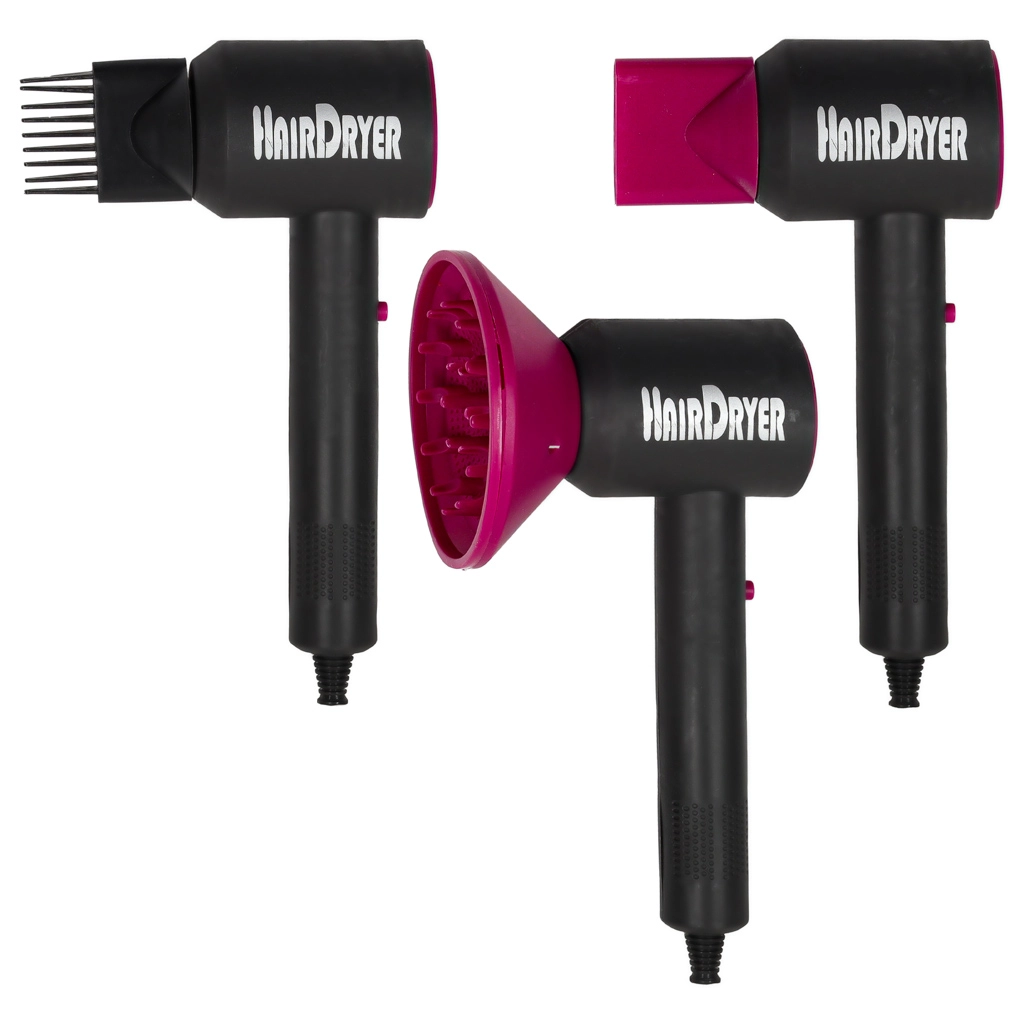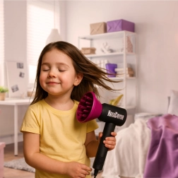 Kompaktní dětský fén se zvukovým efektem a výměnnými nástavci – koncentrátor, difuzér a hřebenový nástavec – pro směrování proudu vzduchu a tvorbu objemu i vln.