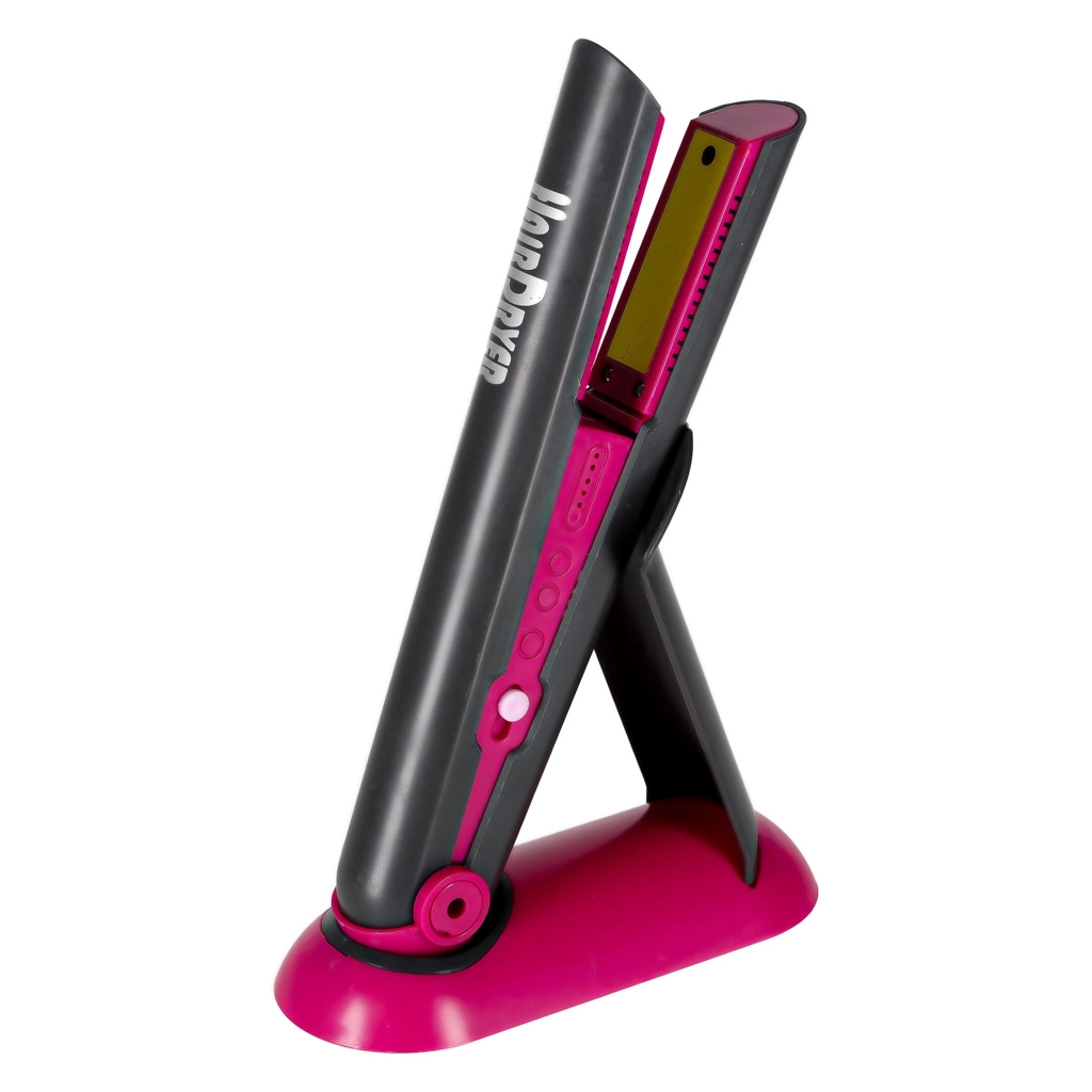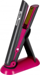 Dětská žehlička na vlasy po stisku svítí a napodobuje provoz, aniž by se zahřívala. Součástí je praktický dvoudílný stojánek pro bezpečné odkládání.