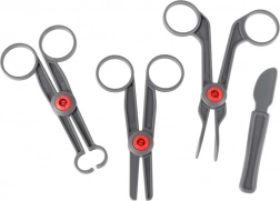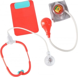 V sadě najdete vše potřebné pro malé doktory: stetoskop (svítí a vydává zvuky), tlakoměr, ultrazvuk (svítí), svítilnu (svítí), elektronický teploměr (svítí a vydává zvuky), zubní endoskop (svítí), pulzní oxymetr, neurologické kladívko, nůžky, kleště a pinzetu, skalpel, stříkačku, box na léky, psací podložku s klipem a 6 snímků RTG a EKG.