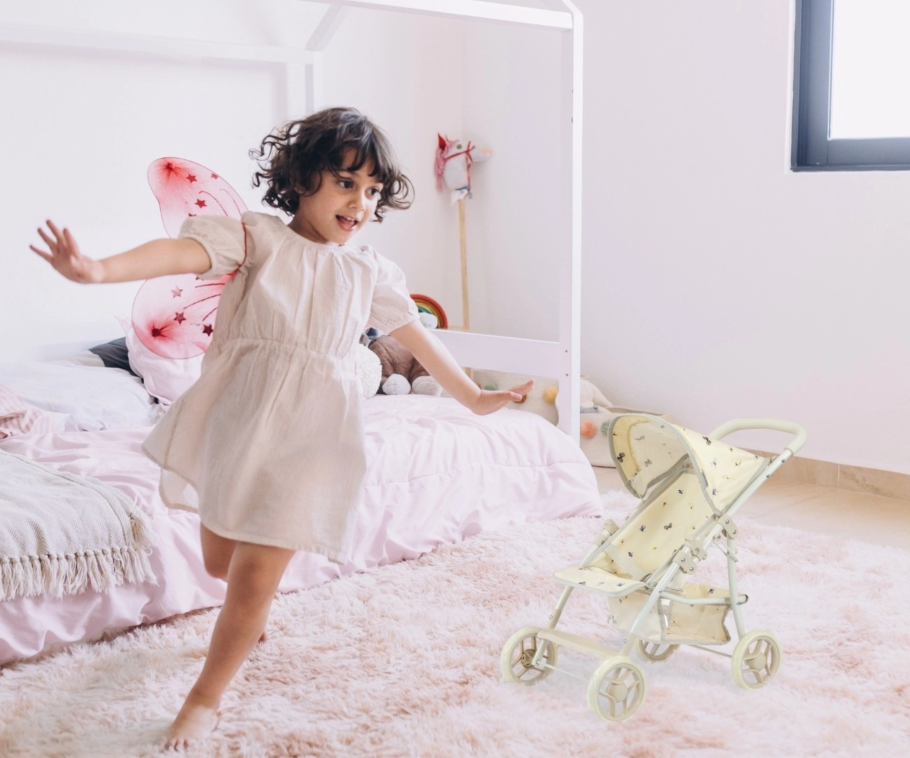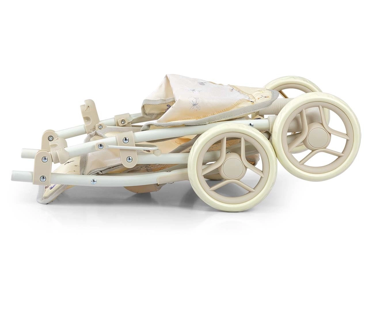 Díky kovovému rámu a posuvu na plochu se kočárek snadno přenáší i skladuje. Textilní potah z polyesteru lze sejmout a prát, takže kočárek zůstane čistý i při každodenním používání. Zabezpečení proti samovolnému složení zajišťuje klidné a bezpečné hraní.
