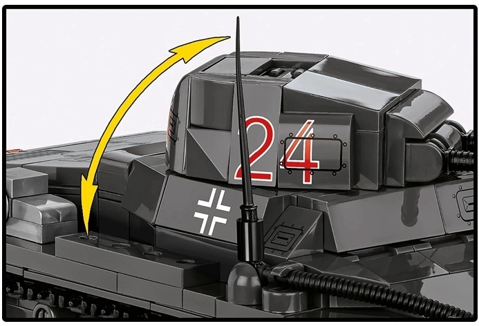 Otočná věž o 360°, nastavitelná výzbroj a realistické pásy s koly umožní dynamické scény, plynulý pohyb a atraktivní prezentaci modelu.