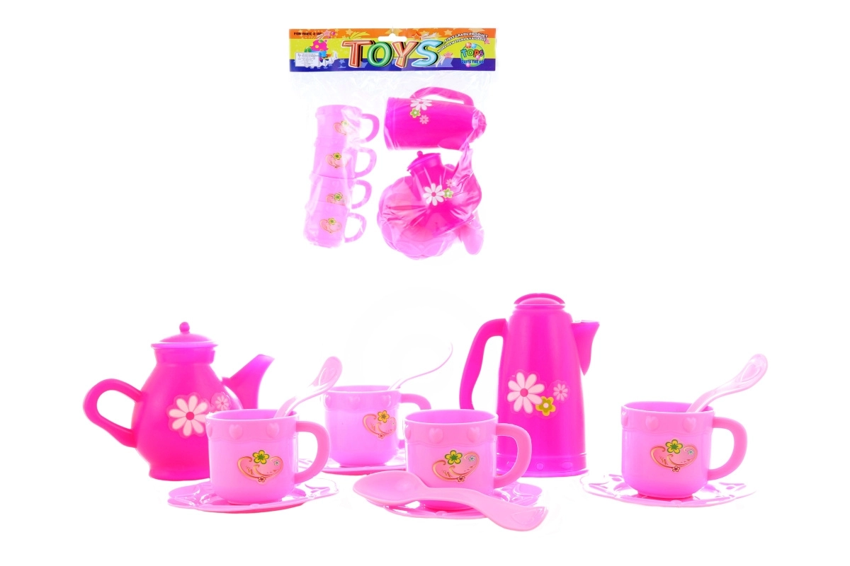 Roztomilý růžový čajový set je ideální pro dětské čajové dýchánky a hraní na hostitelku. Obsahuje vše potřebné pro servírování – 4 šálky, 4 tácky, 4 lžičky a 2 konvice. Vyrobeno z lehkého plastu, vhodné pro děti od 3 let.