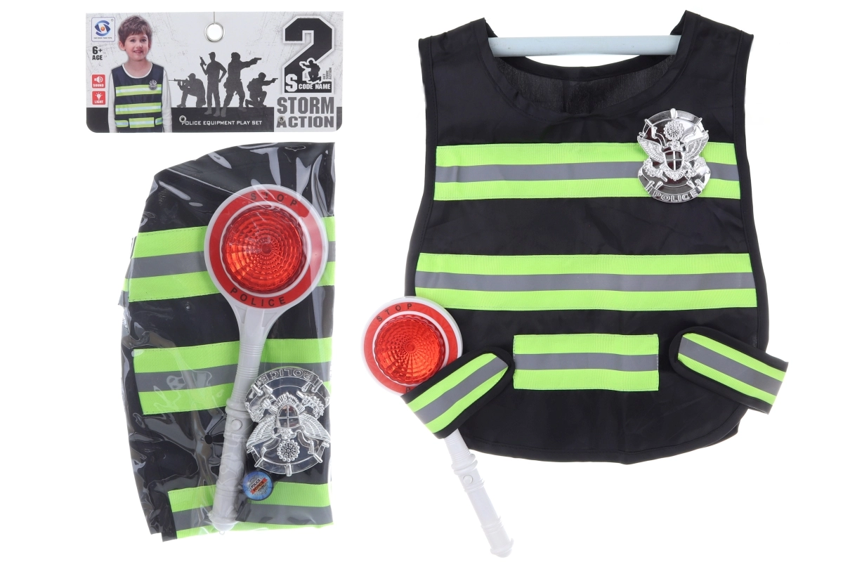 Staňte se malým strážcem pořádku s touto kompletní policejní sadou! Balení obsahuje policejní vestu, odznak a svítící plácačku na baterie. Ideální pro dětské hry na policistu, podporuje fantazii a rolové hraní. Napájení zajišťují 3× AG13 baterie (součástí balení).