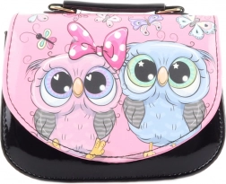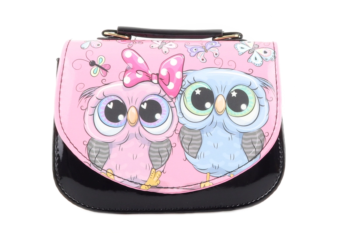 Tato dětská kabelka v elegantní černé barvě s veselým potiskem soviček je skvělá pro nošení drobností, jako jsou kapesníčky, drobné poklady nebo malá peněženka. Lesklá spodní část a barevná klopa s roztomilými detaily upoutají pozornost a potěší každé dítě.