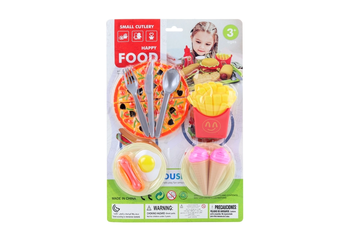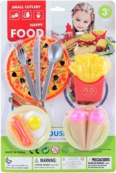 - Obsah sady: pizza na dílky, hranolky v krabičce, hot dog, volské oko, 2 zmrzliny, 2 talířky, příbor