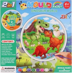 - 5 sáčků se sádrou, 8 barviček, miska, 2 štětečky, kulatá forma s motivem dinosaurů, plastový stojánek