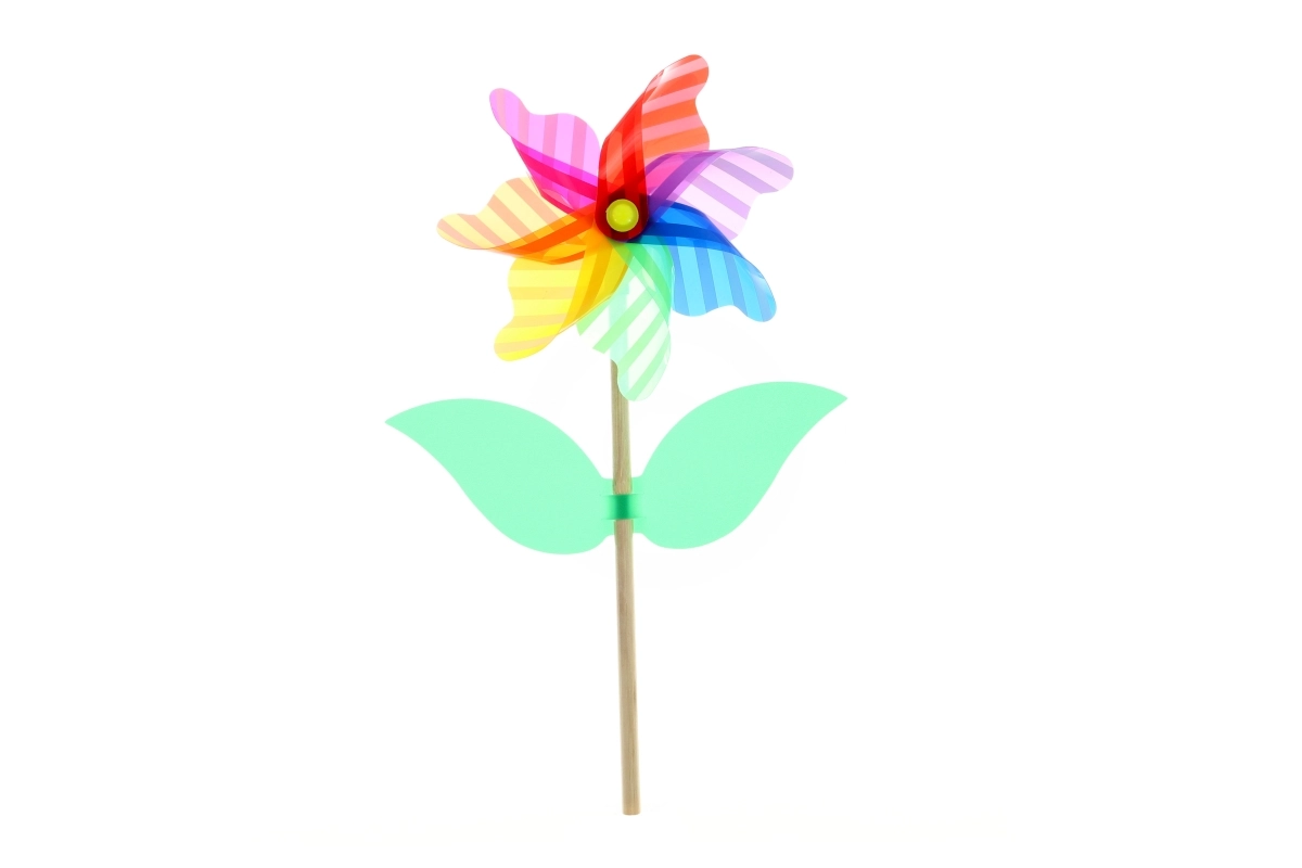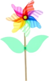Větrník je dodáván rozložený v sáčku a jeho sestavení je snadné a rychlé – ideální jako drobný dárek pro děti, zahradní dekoraci nebo hravou aktivitu na výlety.