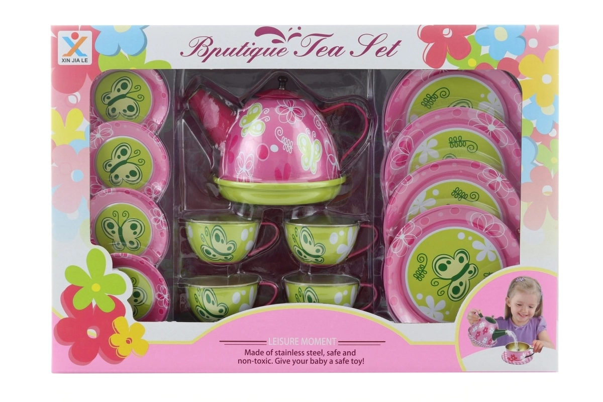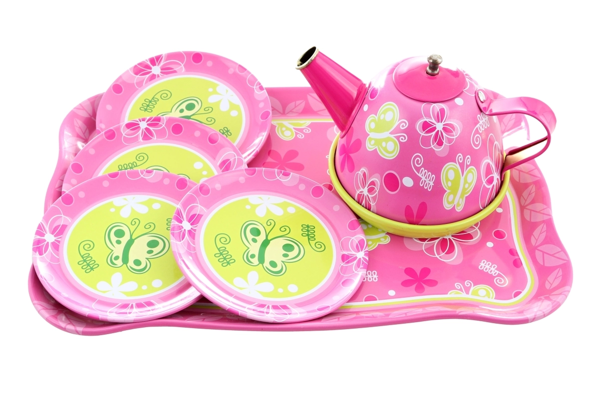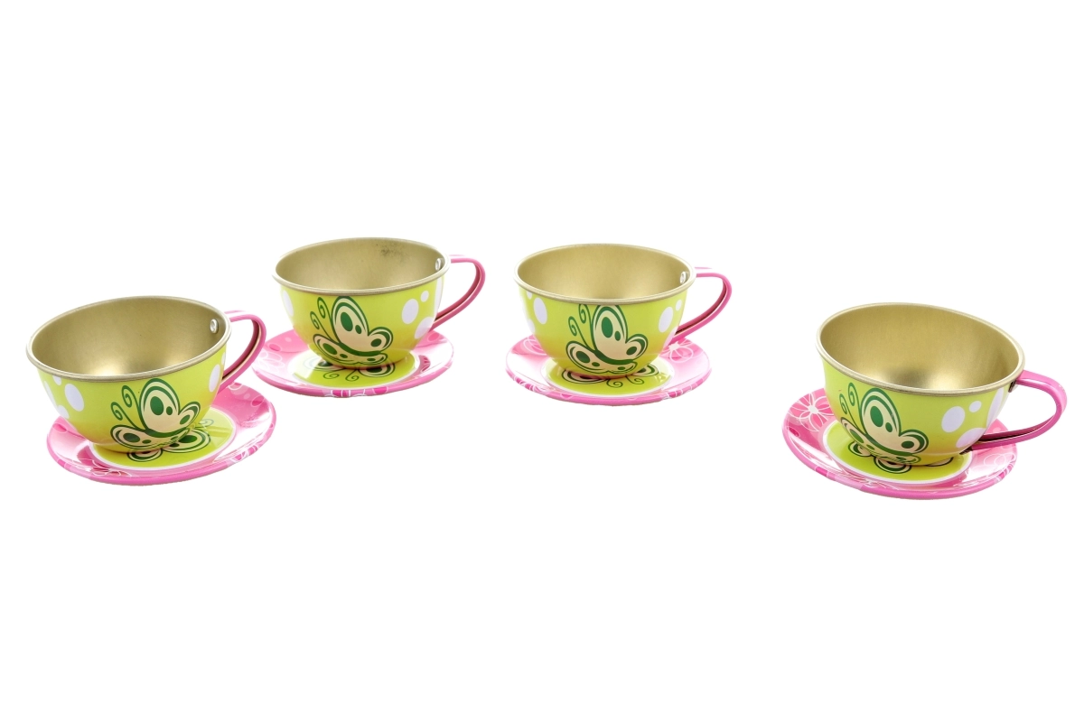 Kouzelný plechový čajový set s motivem motýlků potěší každou malou hostitelku. Obsahuje konvičku, 4 šálky, 4 podšálky a 4 talířky pro hraní na čajový dýchánek. Ideální dárek pro děti od 3 let.