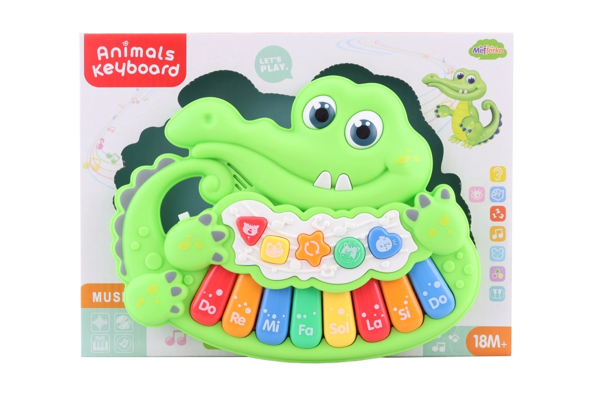 Zábavné plastové piánko ve tvaru krokodýla potěší ty nejmenší prvními melodiemi i zvuky zvířátek. Po zapnutí vydává tóny kláves nebo hlasy zvířátek, takže je ideální pro rozvoj sluchu a motoriky. Napájení zajišťují 3× AA baterie (nejsou součástí balení).