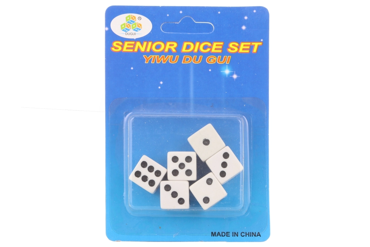 Praktická sada hracích kostek v blistrovém balení obsahuje 6 plastových kostek o velikosti cca 1,5 cm. Kompaktní balení (cca 9 × 12,5 cm) je ideální na cesty, do domácích herních setů i jako náhradní kostky.