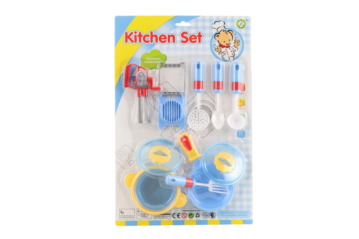 Hrací sada do kuchyňky pro malé kuchaře obsahuje vše potřebné pro hraní na vaření. Najdete v ní hrnec s pokličkou, pánev s pokličkou, obracečku, naběračky, kráječ na vajíčka a ruční šlehač. Baleno na blistru, ideální jako dárek. Vhodné od 3 let.