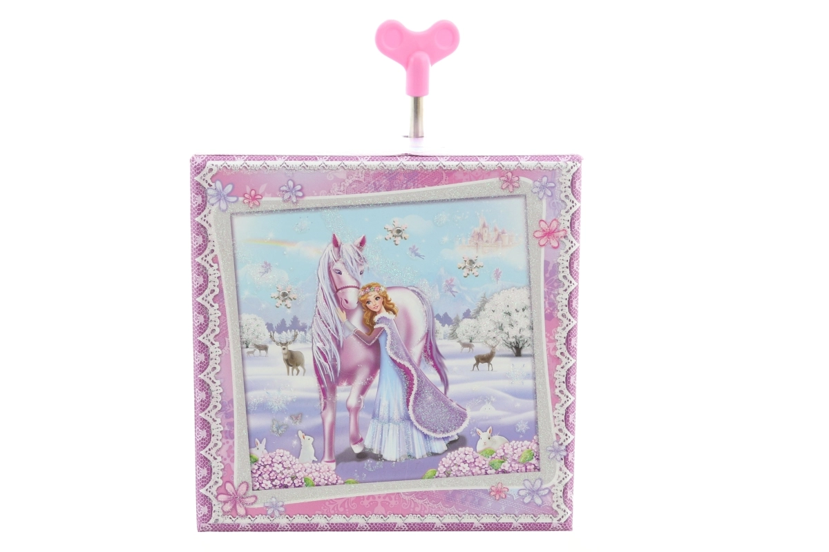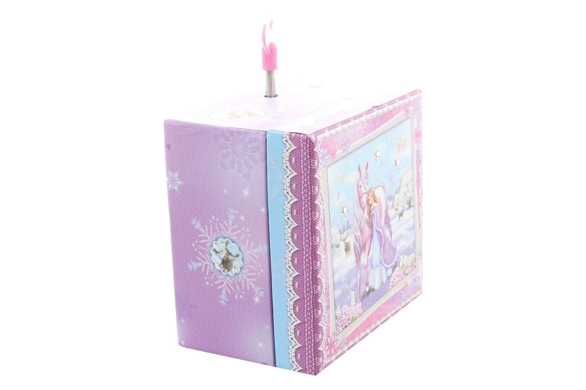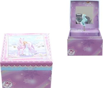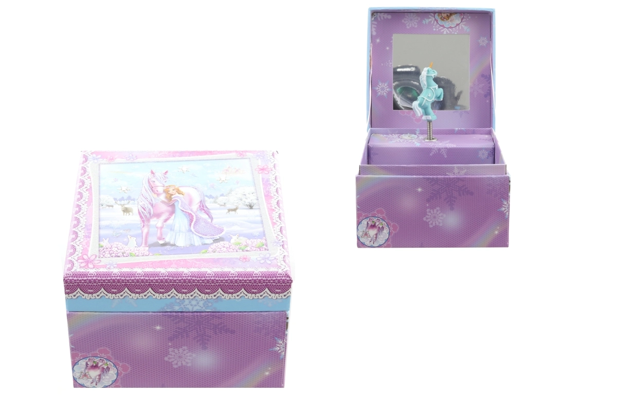 Okouzlující hrací šperkovnice s princeznovským motivem a koněm promění každý pokoj v pohádkové království. Po natažení klíčku se uvnitř roztočí figurka jednorožce, která při melodii elegantně tančí. Vnitřní zrcátko usnadní zkoušení šperků a drobností.