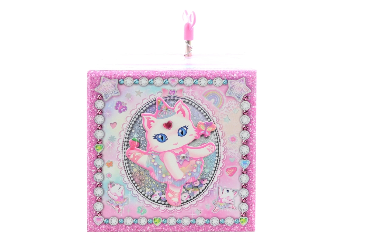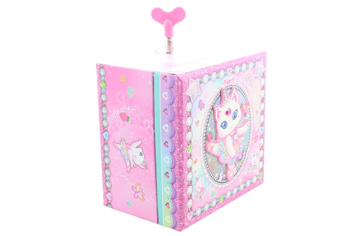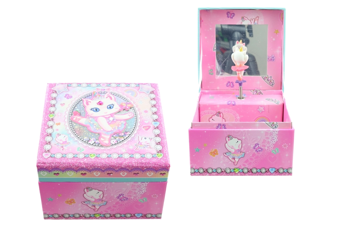 Roztomilá růžová hrací šperkovnice s motivem kočičí baleríny potěší každou malou parádnici. Po natažení klíčku se po otevření víka spustí melodie a figurka kočičky se roztočí před zrcátkem. Nabízí bezpečné uložení drobných pokladů a šperků v jednom stylovém boxu. Hudební mechanismus, zrcátko a tančící kočka vytváří kouzelný zážitek při každém otevření.
