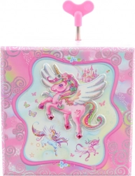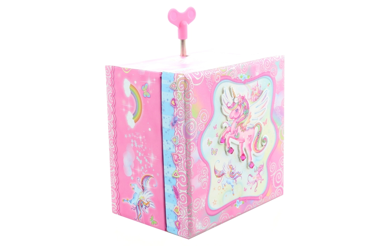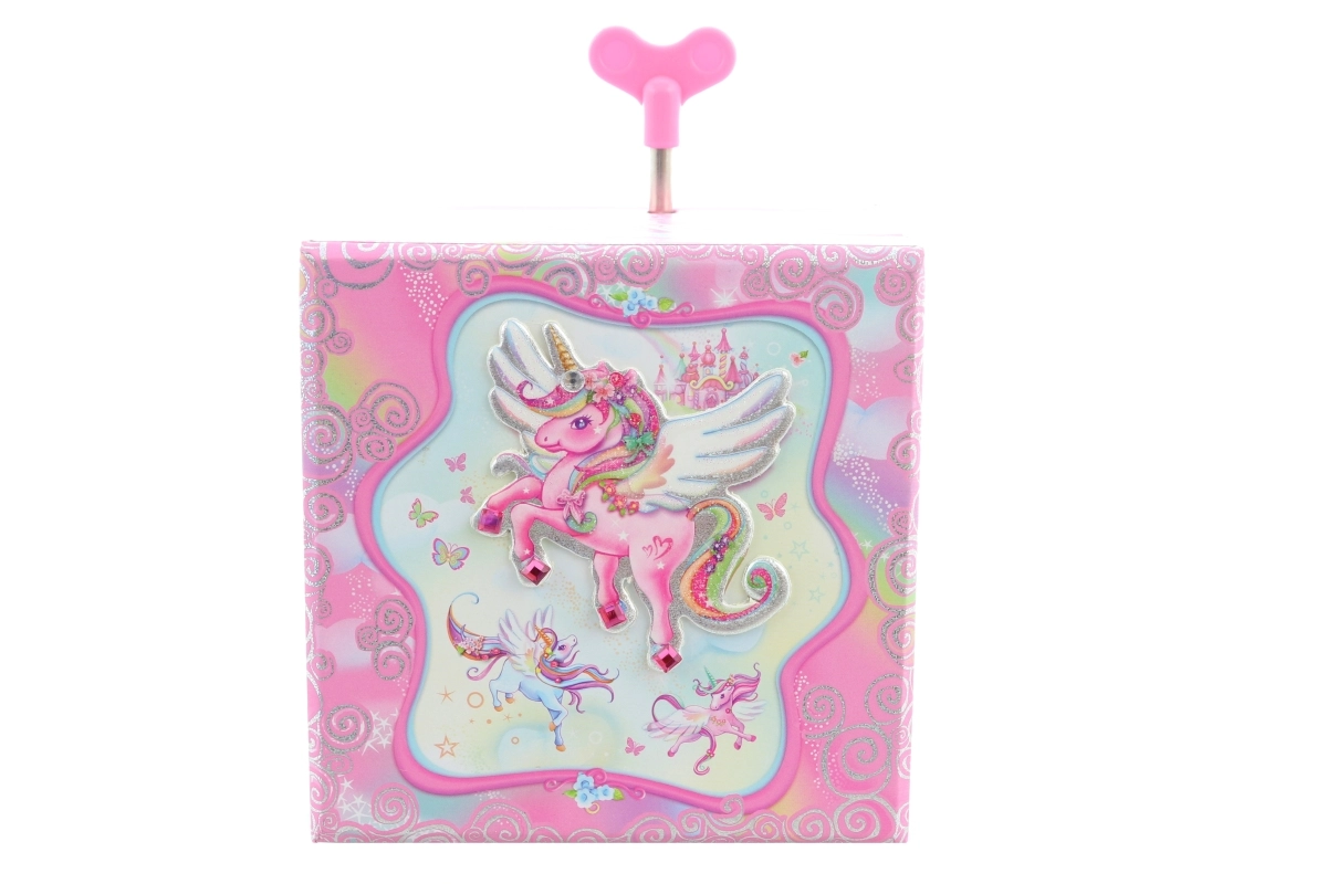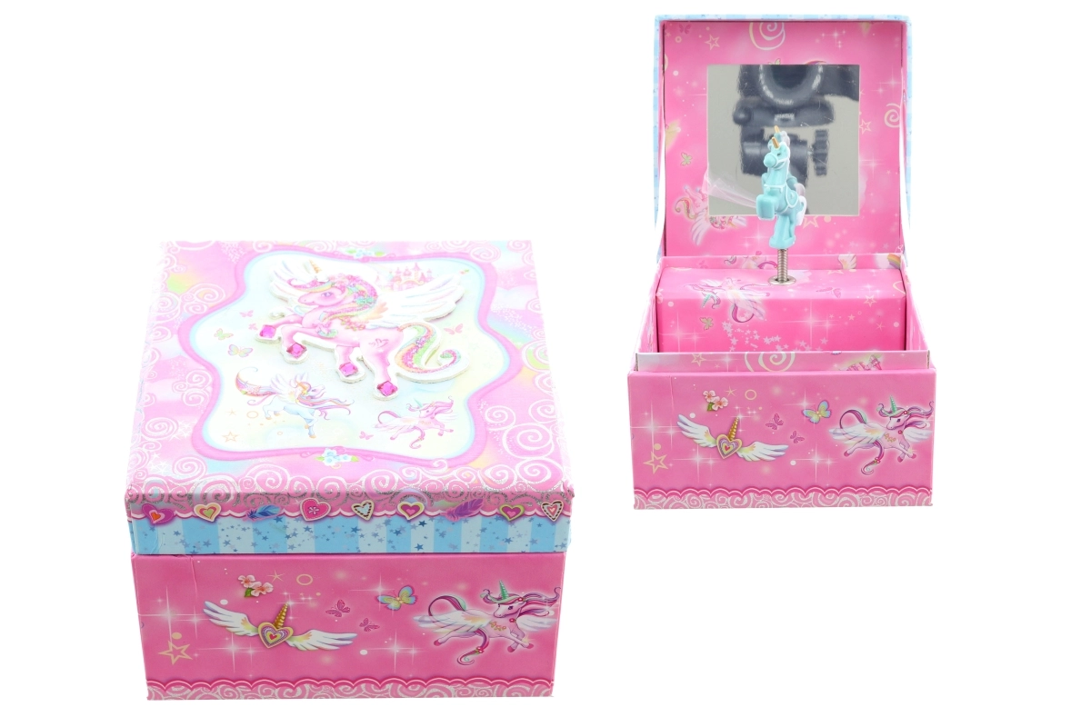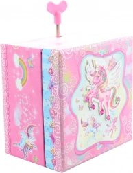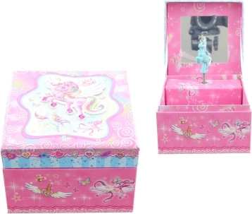 Tato hrací šperkovnice ve tvaru truhličky je ideální pro uchování prstýnků, náušnic a dalších drobností. Po otevření víka se díky natažení klíčku roztančí figurka jednorožce a zazní příjemná melodie, která navodí pohádkovou atmosféru. Uvnitř je umístěné zrcátko pro rychlou kontrolu vzhledu.
