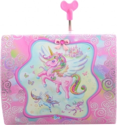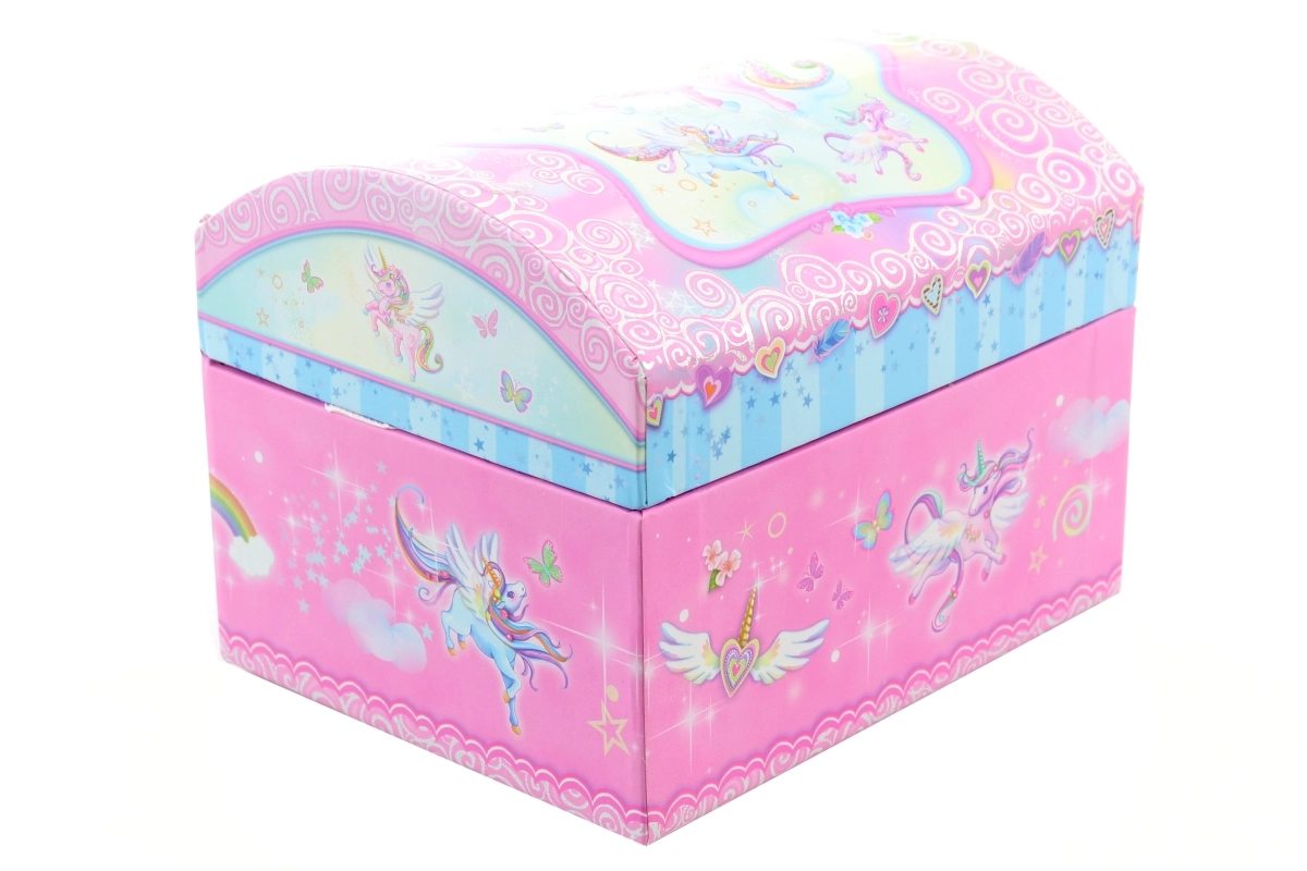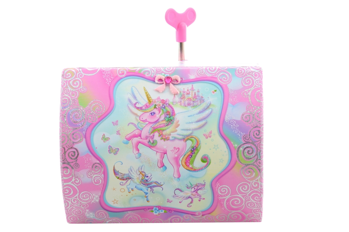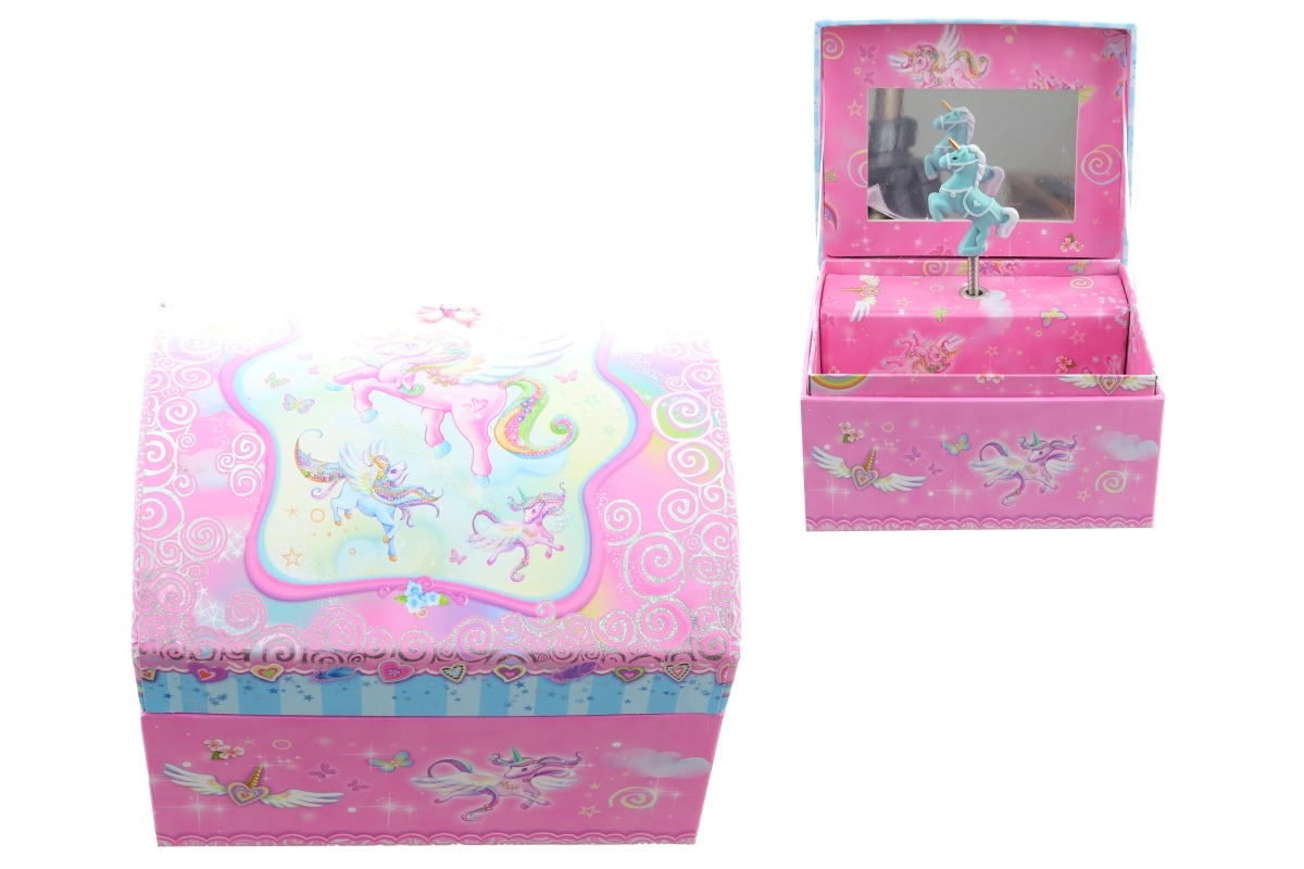 Kouzelná růžová šperkovnice s motivem jednorožců potěší každou malou parádnici. Po natažení mechanismu se uvnitř roztočí figurka baletky a zazní jemná melodie. Nechybí vnitřní zrcátko a prostor na drobné poklady. Ideální jako dárek a krásná dekorace dětského pokoje. Hudební mechanismus, točící se baletka, zrcátko uvnitř, roztomilý motiv jednorožců.