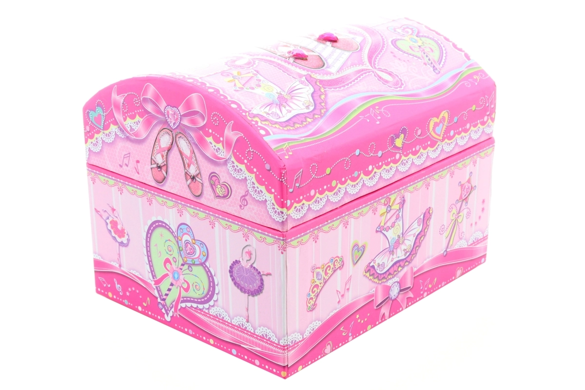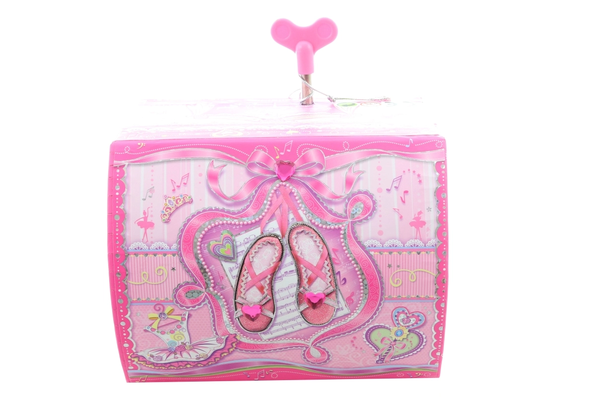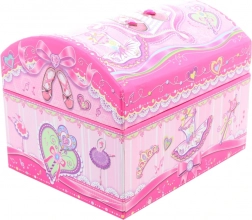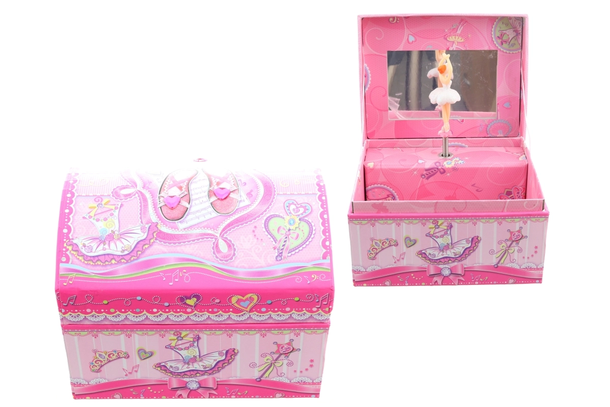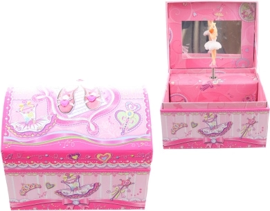 Tato půvabná šperkovnice ve tvaru truhličky je ideálním místem pro uložení prstýnků, náušnic a dalších drobností. Po natažení klíčku a otevření víka se roztočí figurka baletky před zrcátkem a rozezní se melodie, která navodí kouzelnou atmosféru.