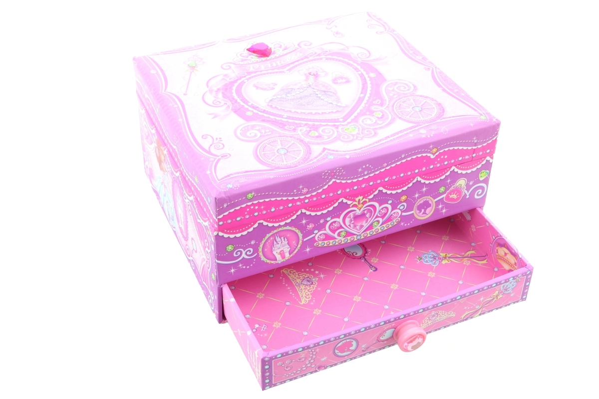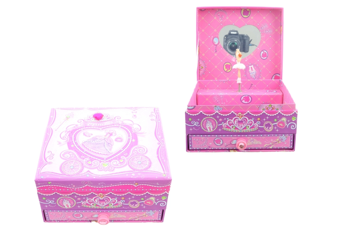 Okouzlující hudební šperkovnice s motivem princezny přináší radost při každém otevření. Po natažení klíčku se roztočí baletka před zrcátkem a zazní něžná melodie, která dotváří pohádkovou atmosféru. Šperkovnice nabízí přehledné uspořádání na drobné šperky a tajné poklady.