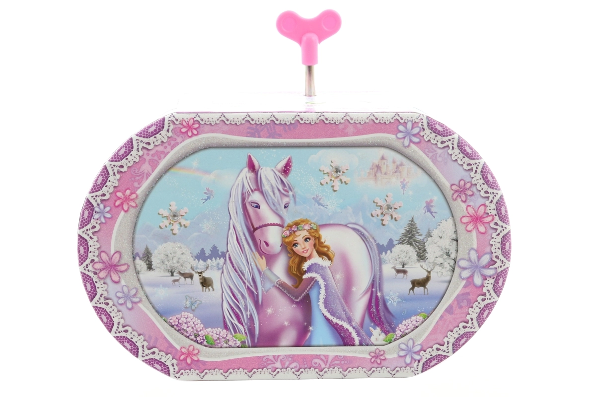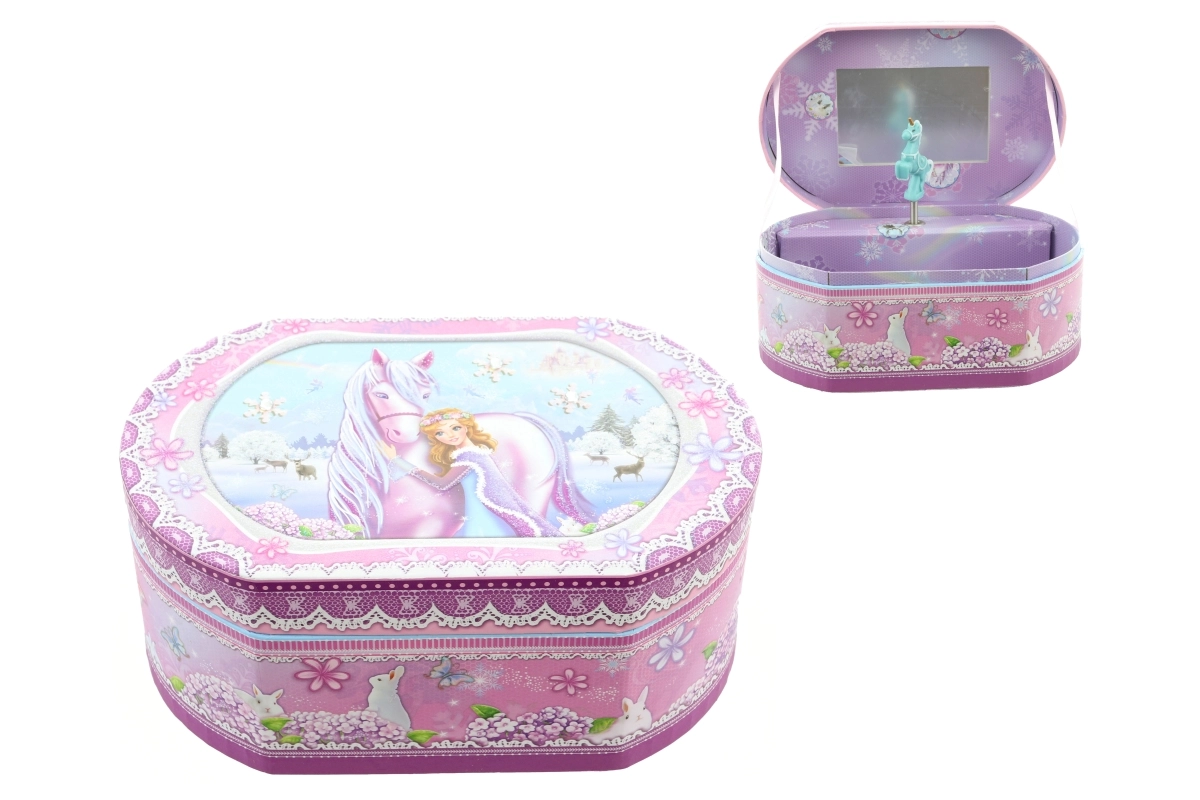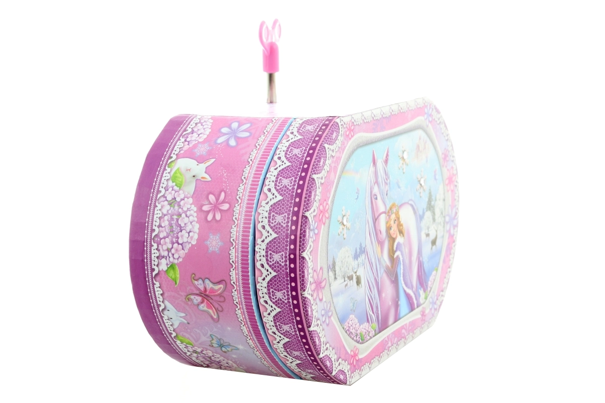 Tato něžná hudební šperkovnice s motivy jednorožce a princezny promění ukládání prstýnků, náušnic a drobných pokladů v kouzelný rituál. Po natažení klíčku se uvnitř roztočí baletka a zazní příjemná melodie, zatímco integrované zrcátko usnadní zkoušení šperků.