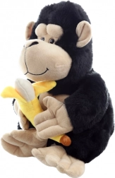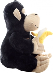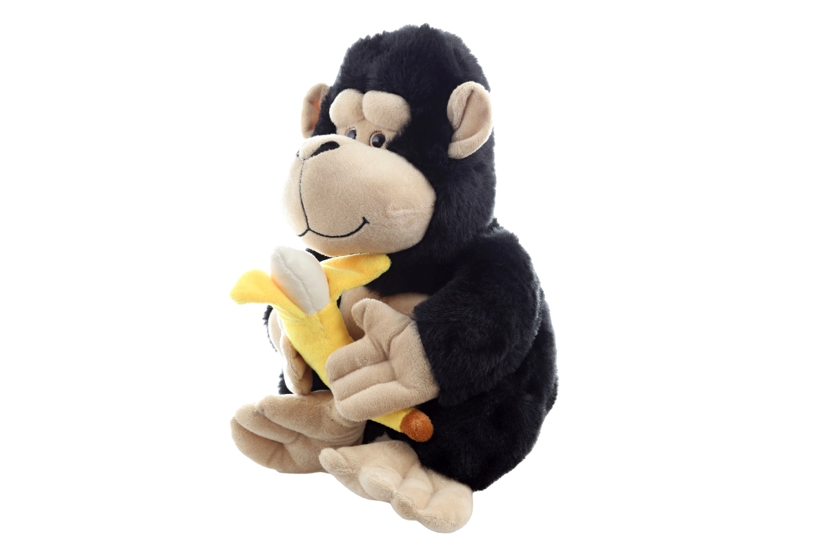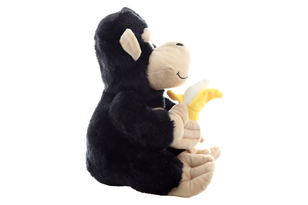 Tato plyšová gorila o velikosti 28 cm zaujme na první pohled svým jemným černým kožíškem a kontrastní béžovou tvářičkou, tlapkami a chodidly. Do tlapek si hrdě drží měkoučký žlutý banán – roztomilý doplněk, který vybízí k imaginativní hře a vyprávění příběhů.