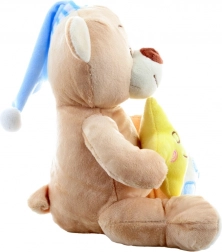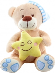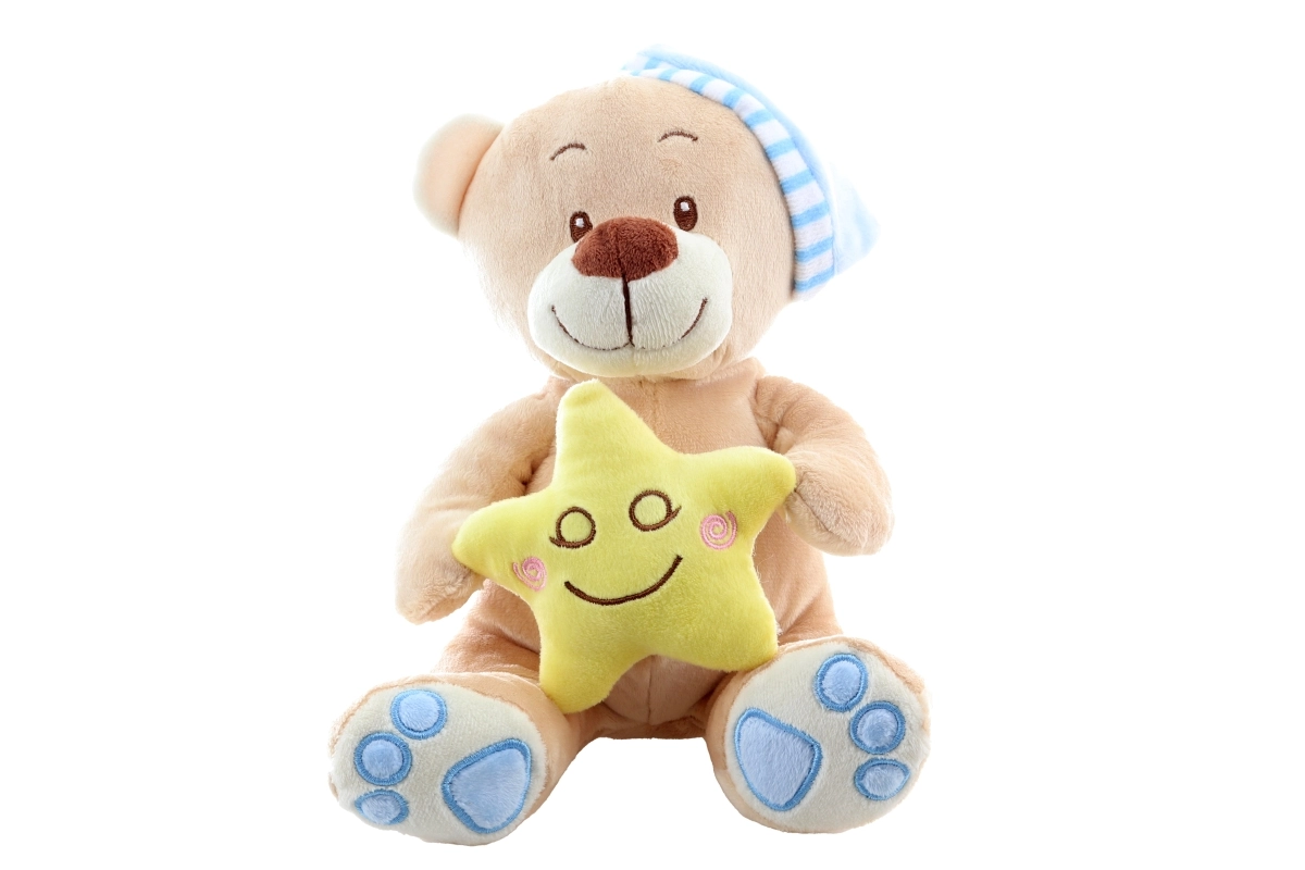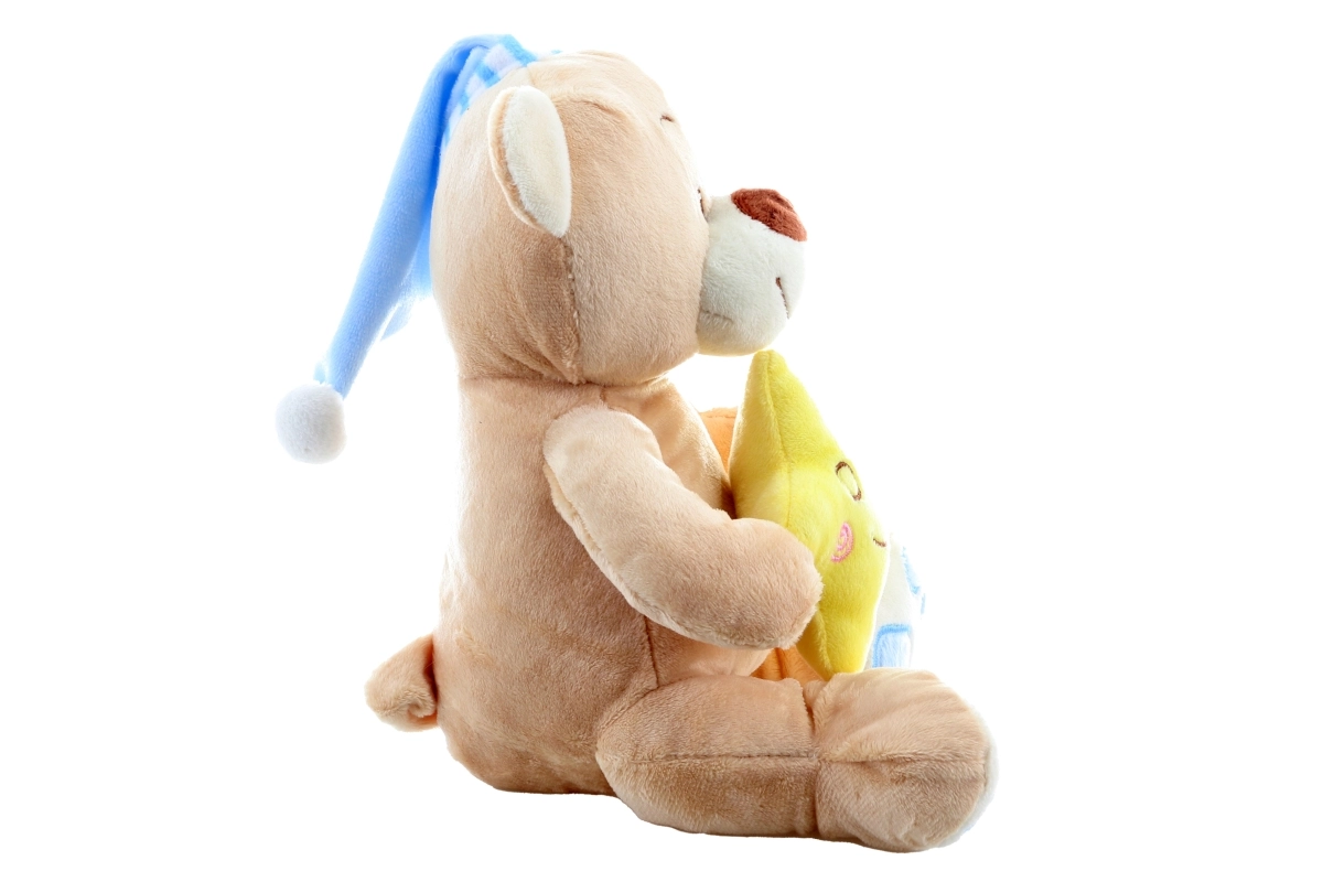 Měkoučký plyš, uklidňující modrá čepička a žlutá hvězdička pomáhají vytvořit příjemnou atmosféru před spaním.