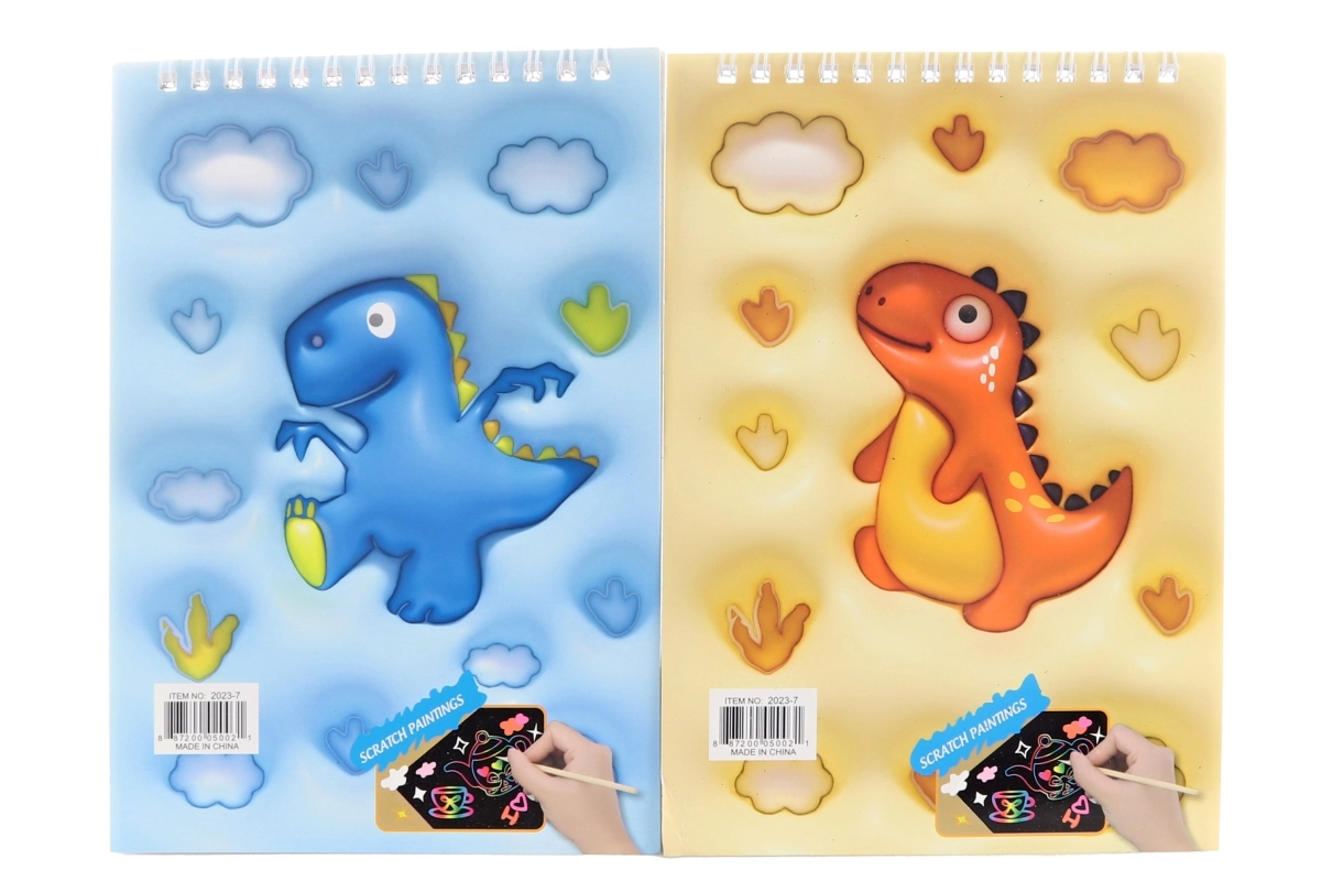 Objevte kouzlo vyškrabovacích obrázků s praktickým sešitem s motivem dinosaura. Stačí vzít přiložené dřevěné pero a jemným vyškrabováním černé vrstvy odhalíte pestré barvy podkladu. Skvělé pro rozvoj kreativity, trpělivosti a jemné motoriky.