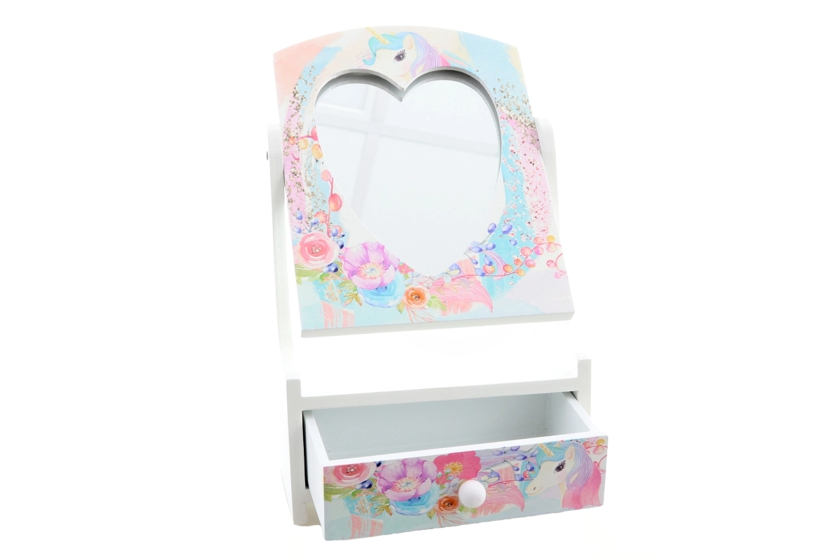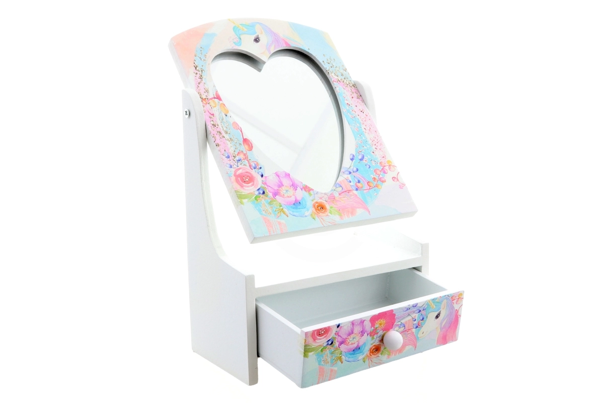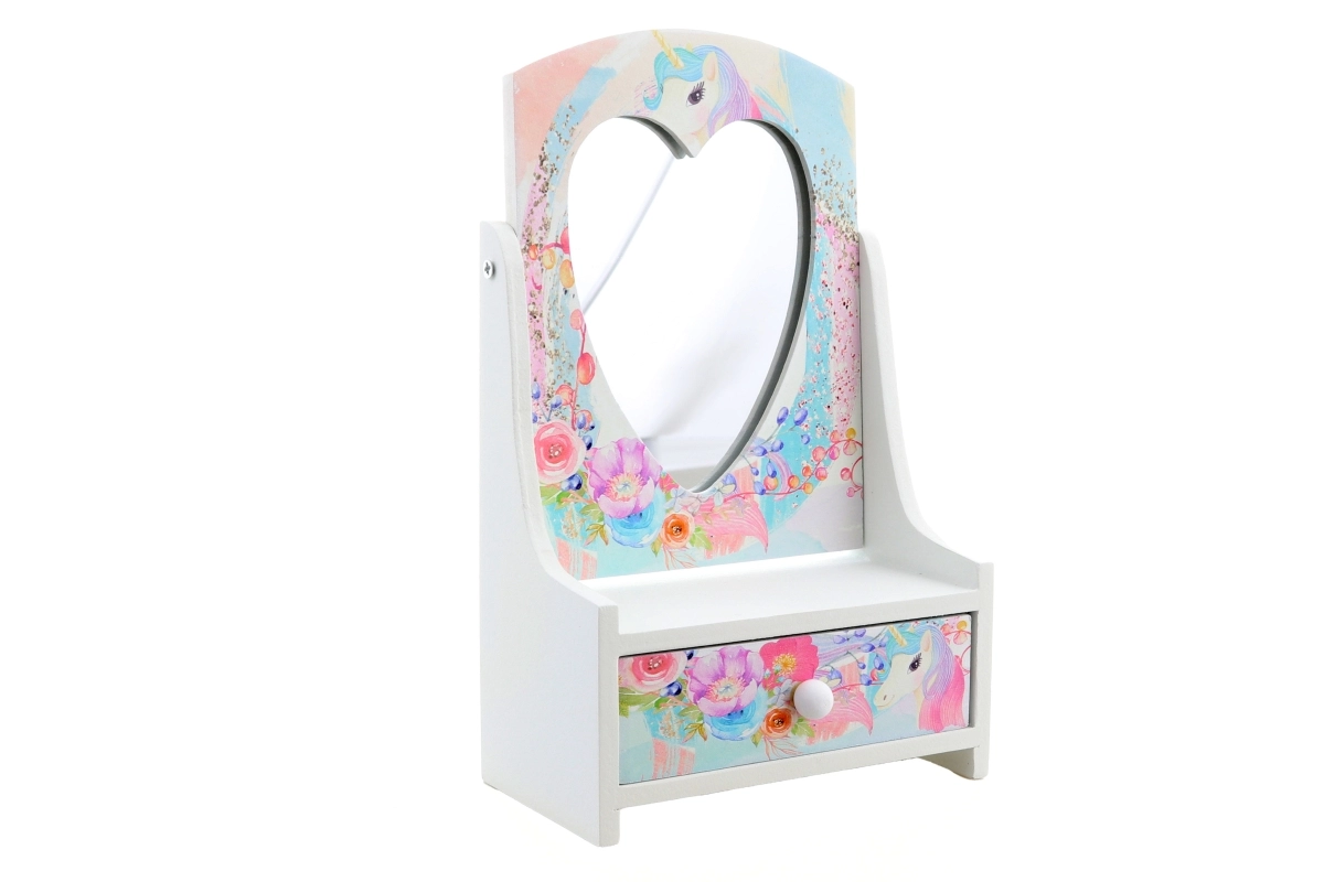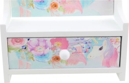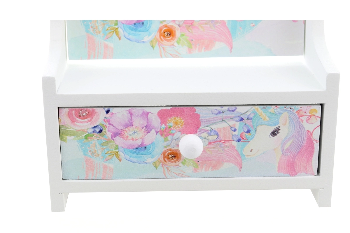 Kouzelná dětská šperkovnice s srdcovým zrcátkem a jednorožčím motivem je ideální pro ukládání drobných pokladů. Nabízí praktický šuplíček, stabilní dřevěné provedení a bezpečné používání od 3 let.