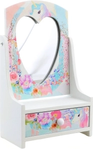 Roztomilá dřevěná šperkovnice s naklápěcím srdcovým zrcátkem pomůže dětem mít své poklady přehledně na jednom místě. Jemné pastelové květinové a jednorožčí motivy z ní dělají krásnou dekoraci dětského pokoje i praktického pomocníka pro každodenní česání a hry.
